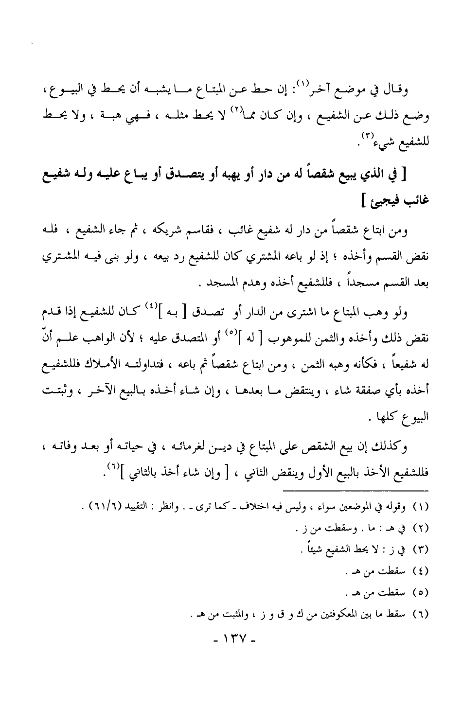 3621 - ولو وهب المبتاع ما اشترى من الدار أو تصدق [به] كان للشفيع إذا قدم نقض ذلك وأخذه والثمن للموهوب [له] أو المتصدق عليه، لأن الواهب علم أن له شفيعاً، فكأنه وهبه الثمن، ومن ابتاع شقصاً ثم باعه، فتداولته الأملاك فللشفيع أخذه بأي صفقة شاء، وينتقض ما بعدها، وإن شاء أخذه بالبيع الآخر، وثبتت البيوع كلها.