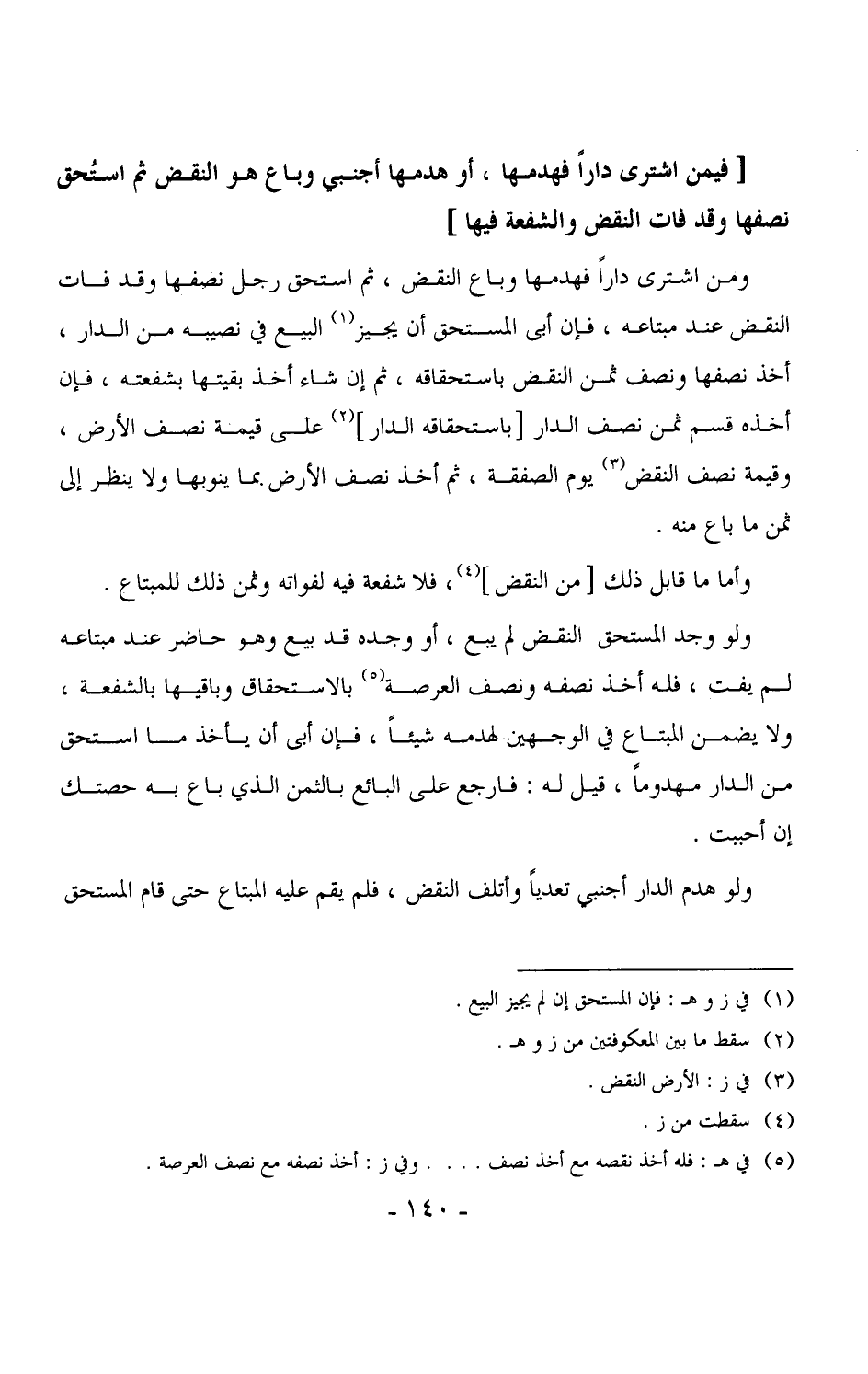 3628 - ومن اشترى داراً فهدمها وباع النقض، ثم استحق رجل نصفها وقد فات النقض عند مبتاعه، فإن أبى المستحق أن يجيز البيع في نصيبه من الدار، أخذ نصفها ونصف ثمن القض باستحقاقه، ثم إن شاء أخذ بقيتها بشفعته، فإن أخذه قسم ثمن نصف الدار [باستحقاقه الدار] على قيمة نصف الأرض، وقيمة نصف النقض يوم الصفقة، ثم أخذ نصف الأرض بما ينوبها ولا ينظر إلى ثمن ما باع منه. (¬1)