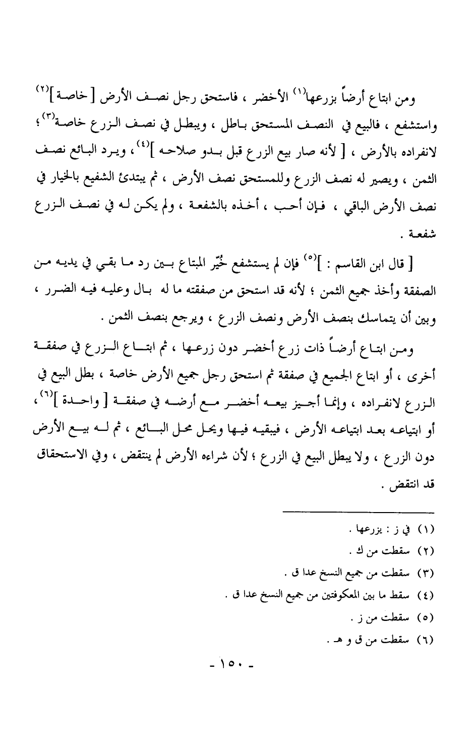 3645 - ومن ابتاع أرضاً ذات زرع أخضر دون زرعها، ثم ابتاع الزرع في صفقة أخرى، أو ابتاع الجميع في صفقة ثم استحق رجل جميع الأرض خاصة، بطل البيع في الزرع لانفراده، وإنما أجيز بيعه أخضر مع أرضه في صفقة [واحدة] ، أو ابتياعه بعد ابتياعه الأرض، فيبقيه فيها ويحل محل البائع، ثم له بيع الأرض دون الزرع، ولا يبطل البيع في الزرع، لأن شراءه الأرض لم ينتقض، وفي الاستحقاق قد انتقض.