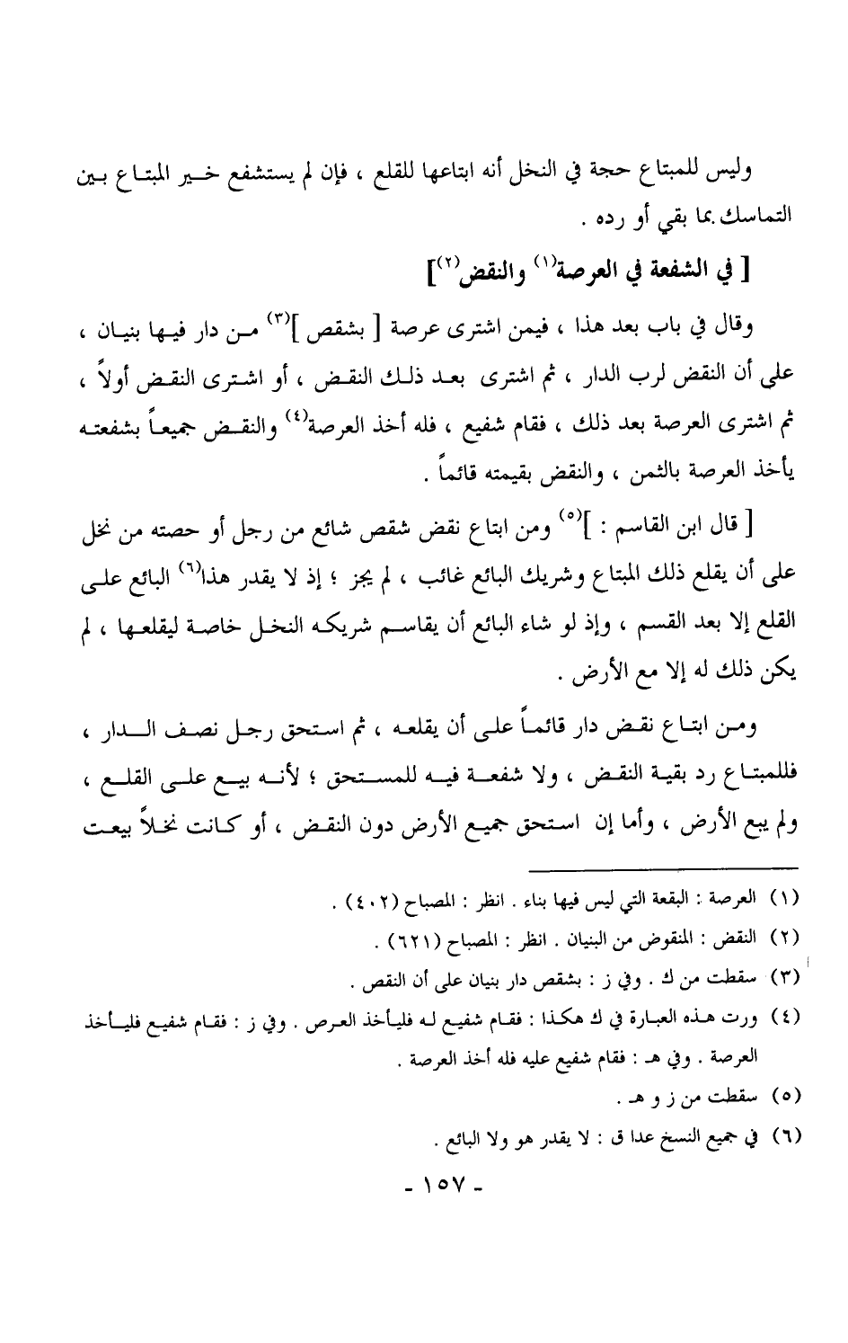 3652 - وقال في باب بعد هذا، فيمن اشترى عرصة [بشقص] من دار فيها بنيان، على أن النقض لرب الدار، ثم اشترى بعد ذلك النقض، أو اشترى التقض أولاً، ثم اشترى العرصة بعد ذلك، فقام شفيع، فله أخذ العرصة والنقض جميعاً بشفعته يأخذ العرصة بالثمن، والنقض بقيمته قائماً.