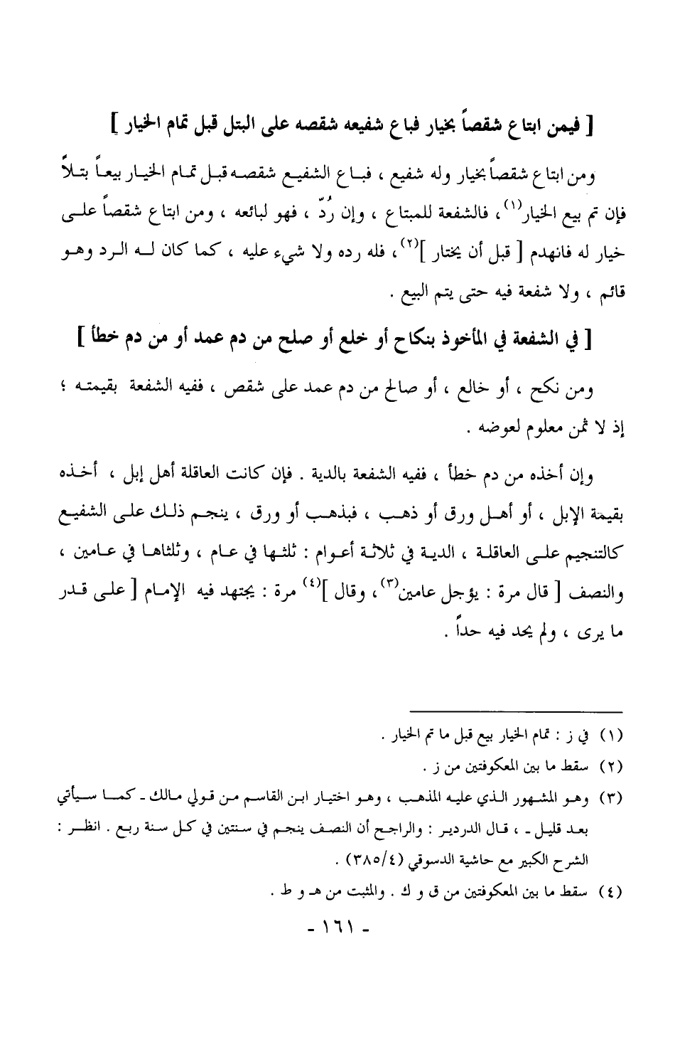 وإن أخذه من دم خطأ، ففيه الشفعة بالدية. فإن كانت العاقلة أهل إبل، أخذه بقيمة الإبل، أو أهل ورق أو ذهب، فبذهب أو ورق، ينجم ذلك على الشفيع كالتنجيم على العاقلة، الدية في ثلاثة أعوام: ثلثها في عام، وثلثاها في عامين، والنصف [قال مرة: يؤجل عامين، وقال] مرة: يجتهد فيه الإمام [على قدر ما يرى، ولم يحد فيه حداً.
