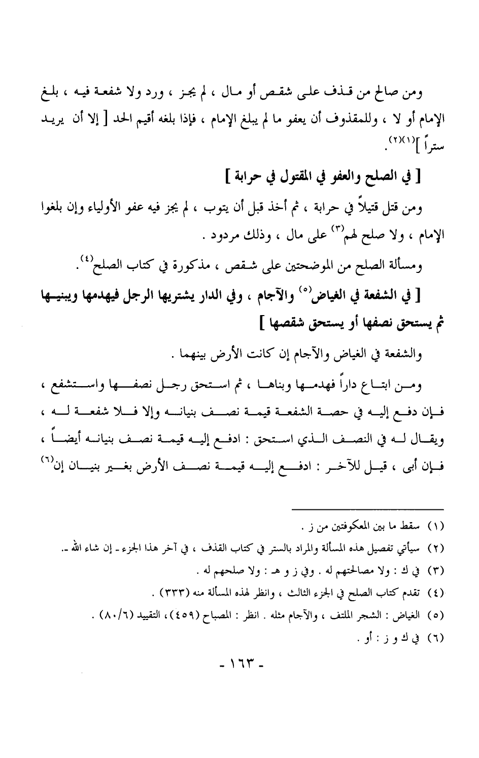 3662 - ومن صالح من قذف على شقص أو مال، لم يجز، ورد ولا شفعة فيه، بلغ الإمام أو لا، وللمقذوف أن يعفو ما لم يبلغ الإمام، فإذا بلغه أقيم الحد [إلا أن يريد ستراً] .