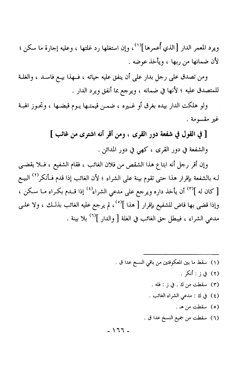 وإن أقر رجل أنه ابتاع هذا الشقص من فلان الغائب، فقام الشفيع، فلا يقضى له بالشفعة بإقرار هذا حتى تقوم بينة على الشراء، لأن الغائب إذا قدم فأنكر البيع [كان له] أن يأخذ داره ويرجع على مدعي الشراء إذا قدم بكراء ما سكن، وإذا قضى بها قاض للشفيع بإقرار [هذا] ، لم يرجع عليه الغائب بذلك، ولا على مدعي الشراء، فيبطل حق الغائب في الغلة [والدار] بلا بينة.