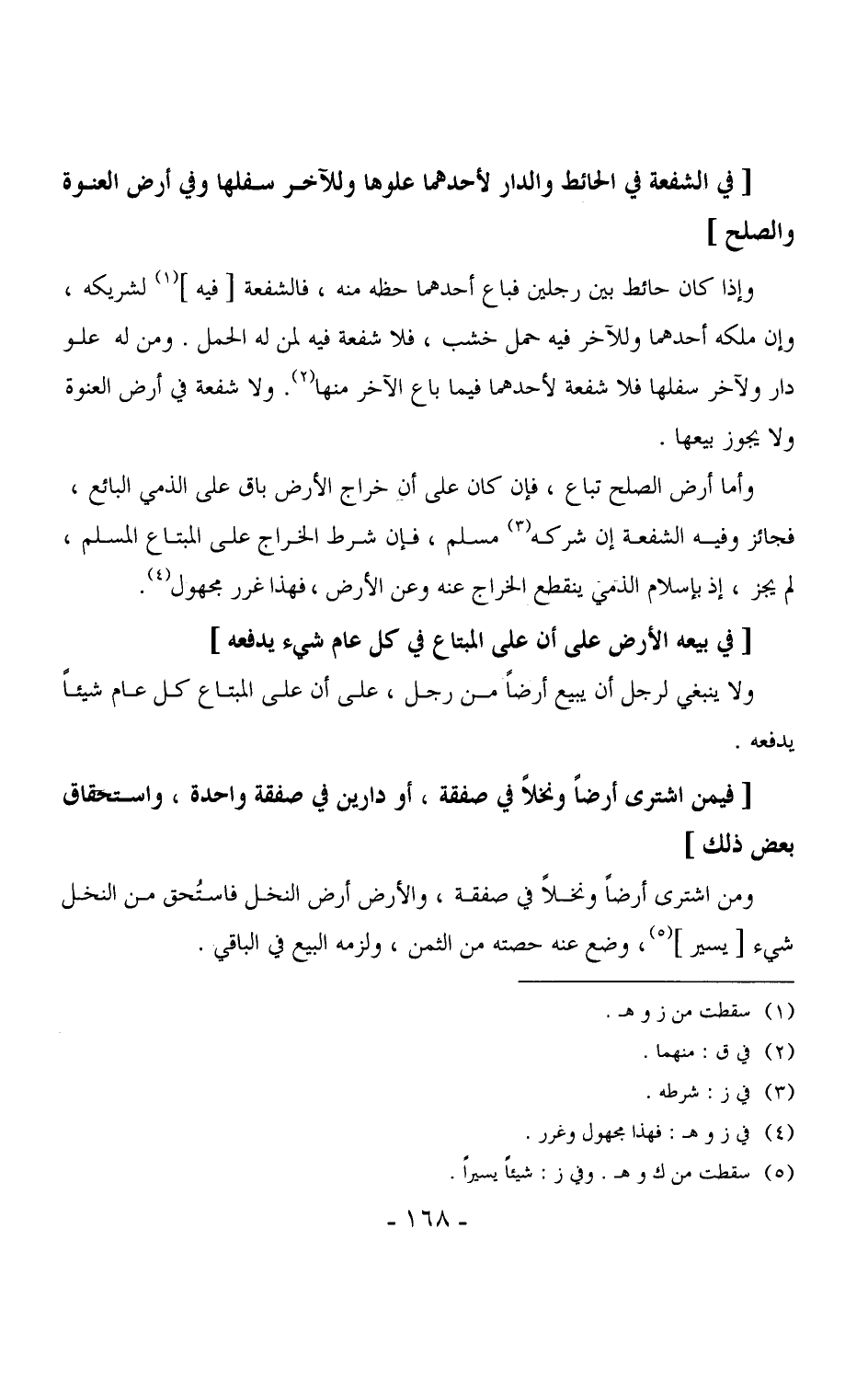 3673 - وإذا كان حائط بين رجلين فباع أحدهما حظه منه، فالشفعة [فيه] لشريكه، وإن ملكه أحدهما وللآخر فيه حمل خشب، فلا شفعة فيه لمن له الحمل. ومن له علو دار ولآخر سفلها فلا شفعة لأحدهما فيما باع الآخر منها. ولا شفعة في أرض العنوة ولا يجوز بيعها.