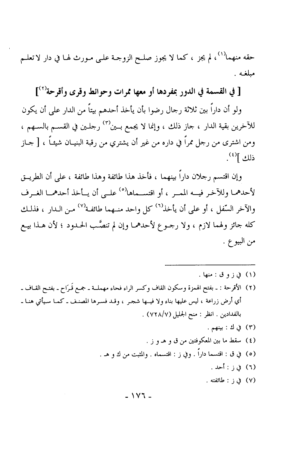 3688 - وإن اقتسم رجلان داراً بينهما، فأخذ هذا طائفة وهذا طائفة، على أن الطريق لأحدهما وللآخر فيه الممر، أو اقتسماها على أن يأخذ أحدهما الغرف والآخر السّفل، أو على أن يأخذ كل واحد منهما طائفة من الدار، فذلك كله جائز ولهما لازم، ولا رجوع لأحدهما وإن لم تنصَّب الحدود، لأن هذا بيع من البيوع.