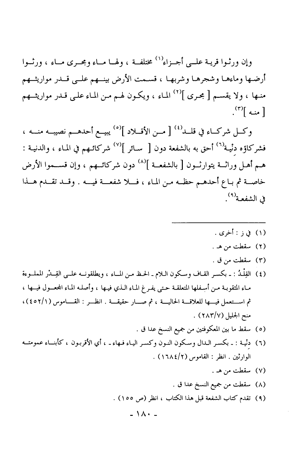 وإن ورثوا قرية على أجزاء مختلفة، ولها ماء ومجرى ماء، ورثوا أرضها وماءها وشجرها وشربها، قسمت الأرض بينهم على قدر مواريثهم منها، ولا يقسم [مجرى] الماء، ويكون لهم من الماء على قدر مواريثهم [منه] .