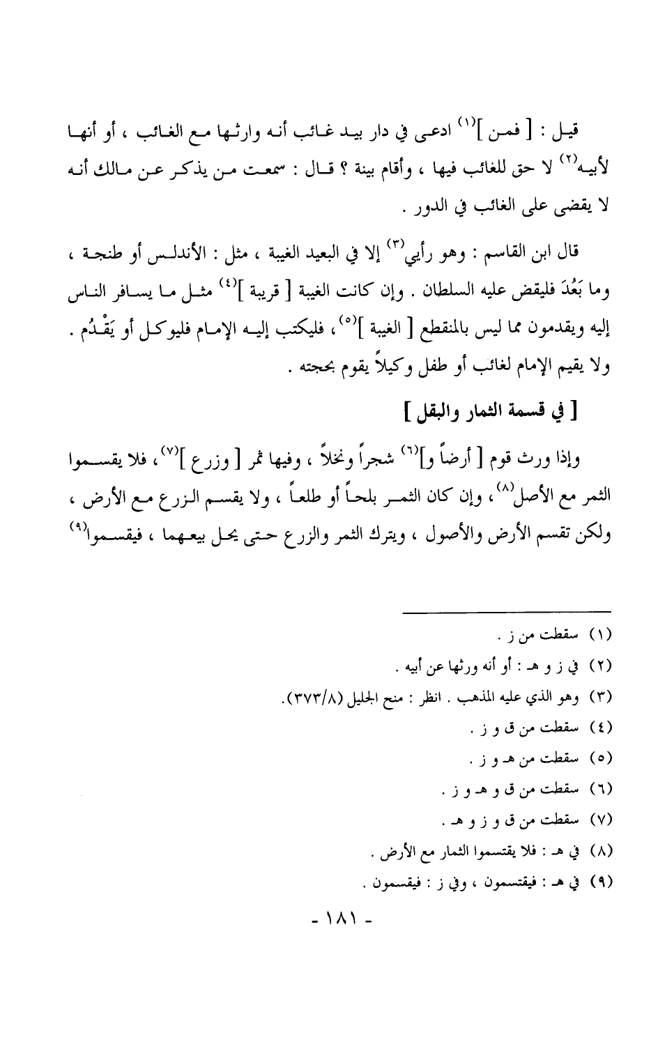 3694 - وإذا ورث قوم [أرضاً و] شجراً ونخلاً، وفيها ثمر [وزرع] ، فلا يقسموا الثمر مع الأصل، وإن كان الثمر بلحاً أو طلعاً، ولا يقسم الزرع مع الأرض، ولكن تقسم الأرض والأصول، ويترك الثمر والزرع حتى يحل بيعهما، فيقسموا