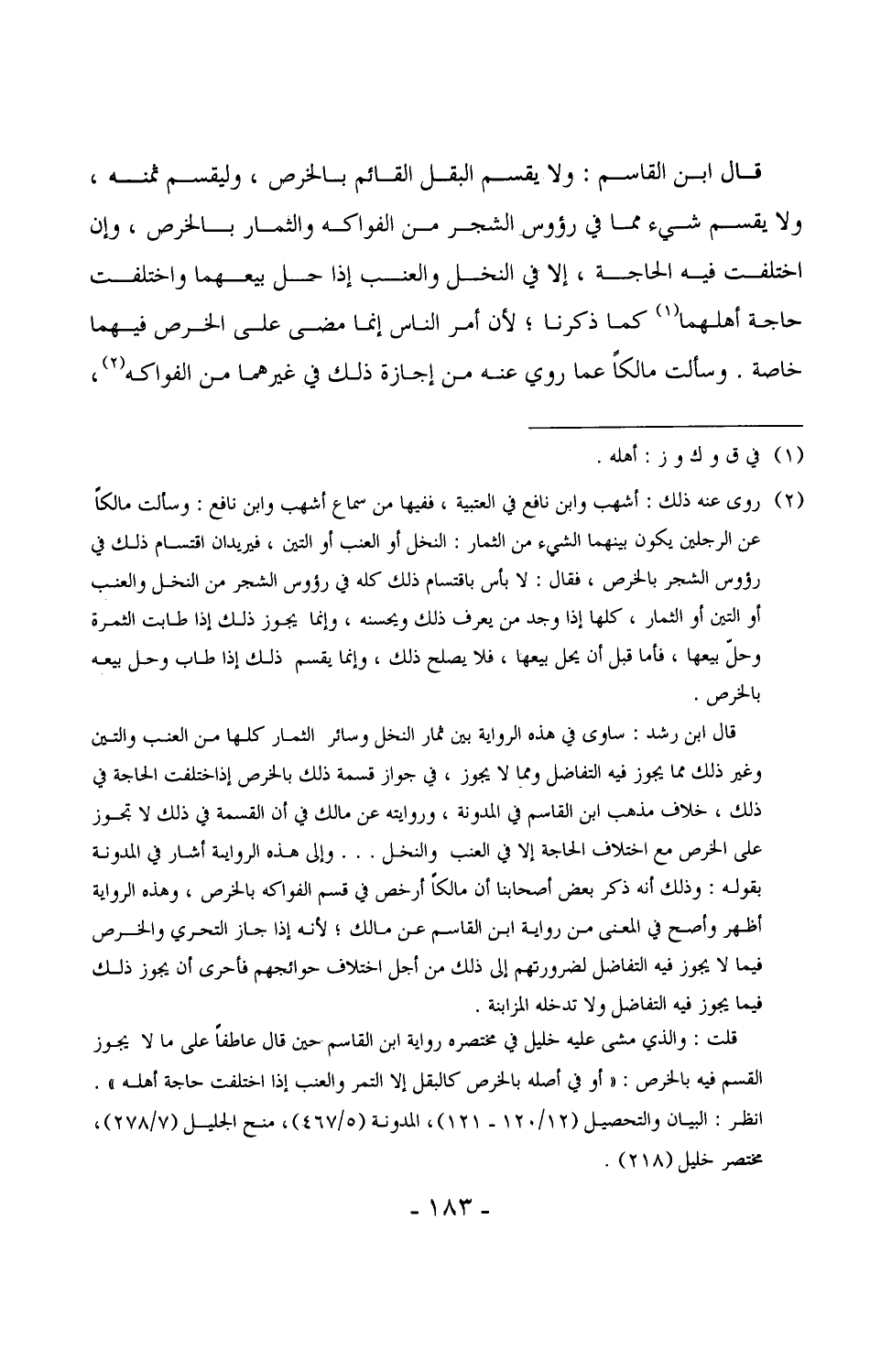 3696 - قال ابن القاسم: ولا يقسم البقل القائم بالخرص، وليقسم ثمنه، ولا يقسم شيء مما في رؤوس الشجر من الفواكه والثمار بالخرص، وإن اختلفت فيه الحاجة، إلا في النخل والعنب إذا حل بيعهما واختلفت حاجة أهلهما كما ذكرنا، لأن أمر الناس إنما مضى على الخرص فيهما خاصة. وسألت مالكاً عما روي عنه من إجازة ذلك في غيرهما من الفواكه،