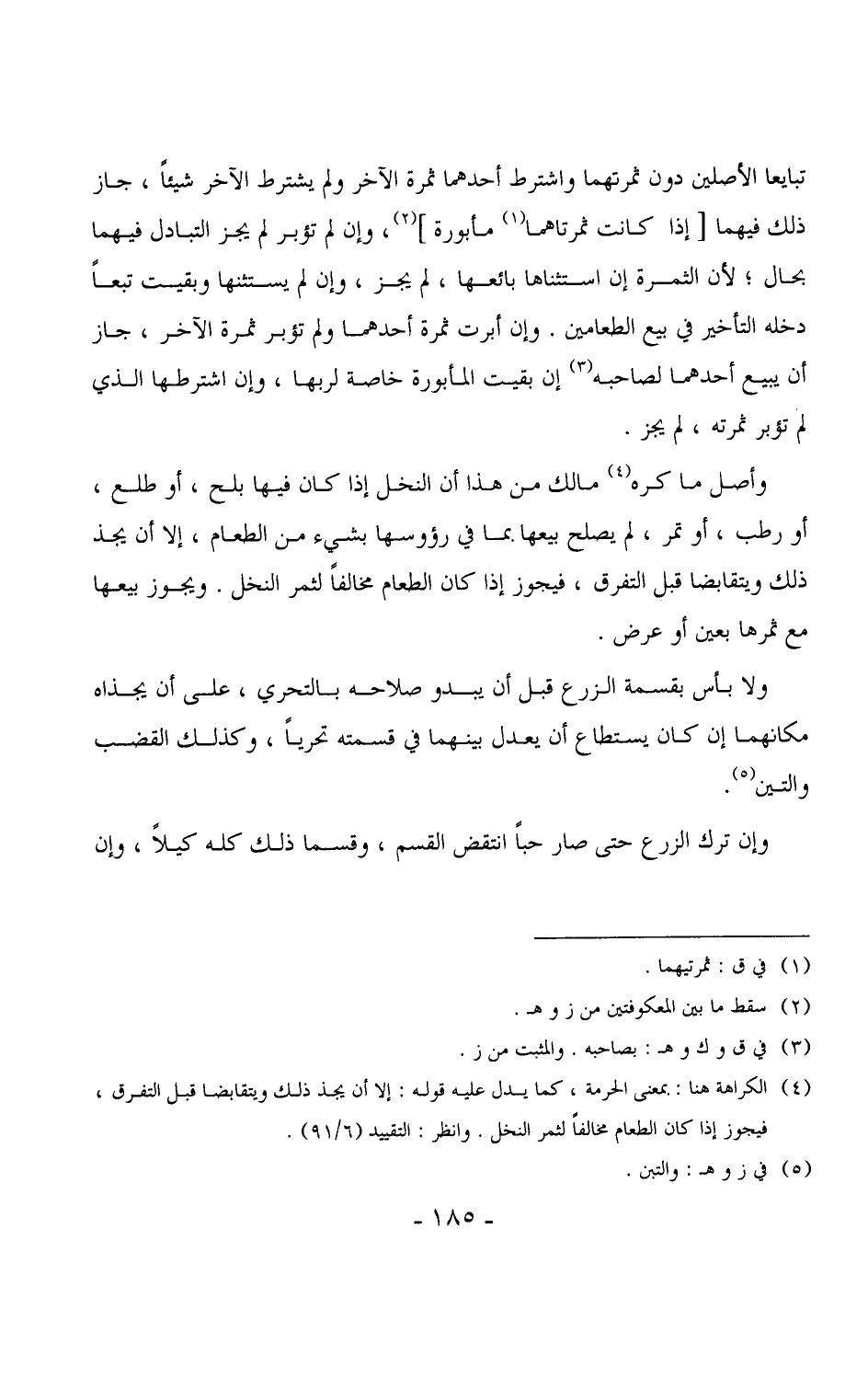 تبايعا الأصلين دون ثمرتهما واشترط أحدهما ثمرة الآخر ولم يشترط الآخر شيئاً، جاز ذلك فيهما [إذا كانت ثمرتاهما مأبورة] ، وإن لم تؤبر لم يجز التبادل فيهما بحال، لأن الثمرة إن استثناها بائعها، لم يجز، وإن لم يستثنها وبقيت تبعاً دخله التأخير في بيع الطعامين. وإن أبرت ثمرة أحدهما ولم تؤبر ثمرة الآخر، جاز أن يبيع أحدهما لصاحبه إن بقيت المأبورة خاصة لربها، وإن اشترطها الذي لم تؤبر ثمرته، لم يجز.