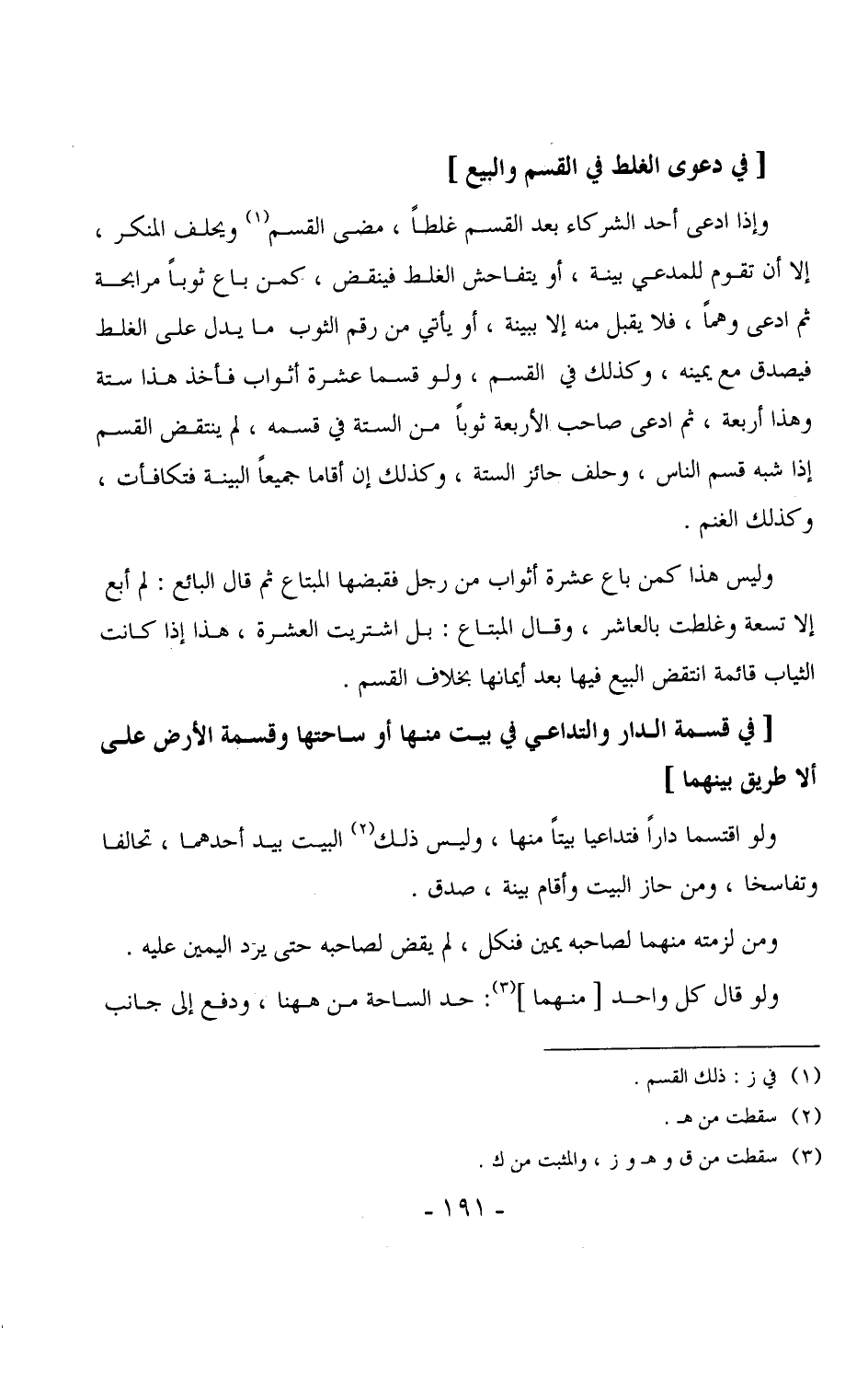 3703 - وإذا ادعى أحد الشركاء بعد القسم غلطاً، مضى القسم ويحلف المنكر، إلا أن تقوم للمدعي بينة، أو يتفاحش الغلط فينقض، كمن باع ثوباً مرابحة ثم ادعى وهماً، فلا يقبل منه إلا ببينة، أو يأتي من رقم الثوب ما يدل على الغلط فيصدق مع يمينه، وكذلك في القسم، ولو قسما عشرة أثواب فأخذ هذا ستة وهذا أربعة، ثم ادعى صاحب الأربعة ثوباً من الستة في قسمه، لم ينتقض القسم إذا شبه قسم الناس، وحلف حائز الستة، وكذلك إن أقاما جميعاً البينة فتكافأت، وكذلك الغنم.