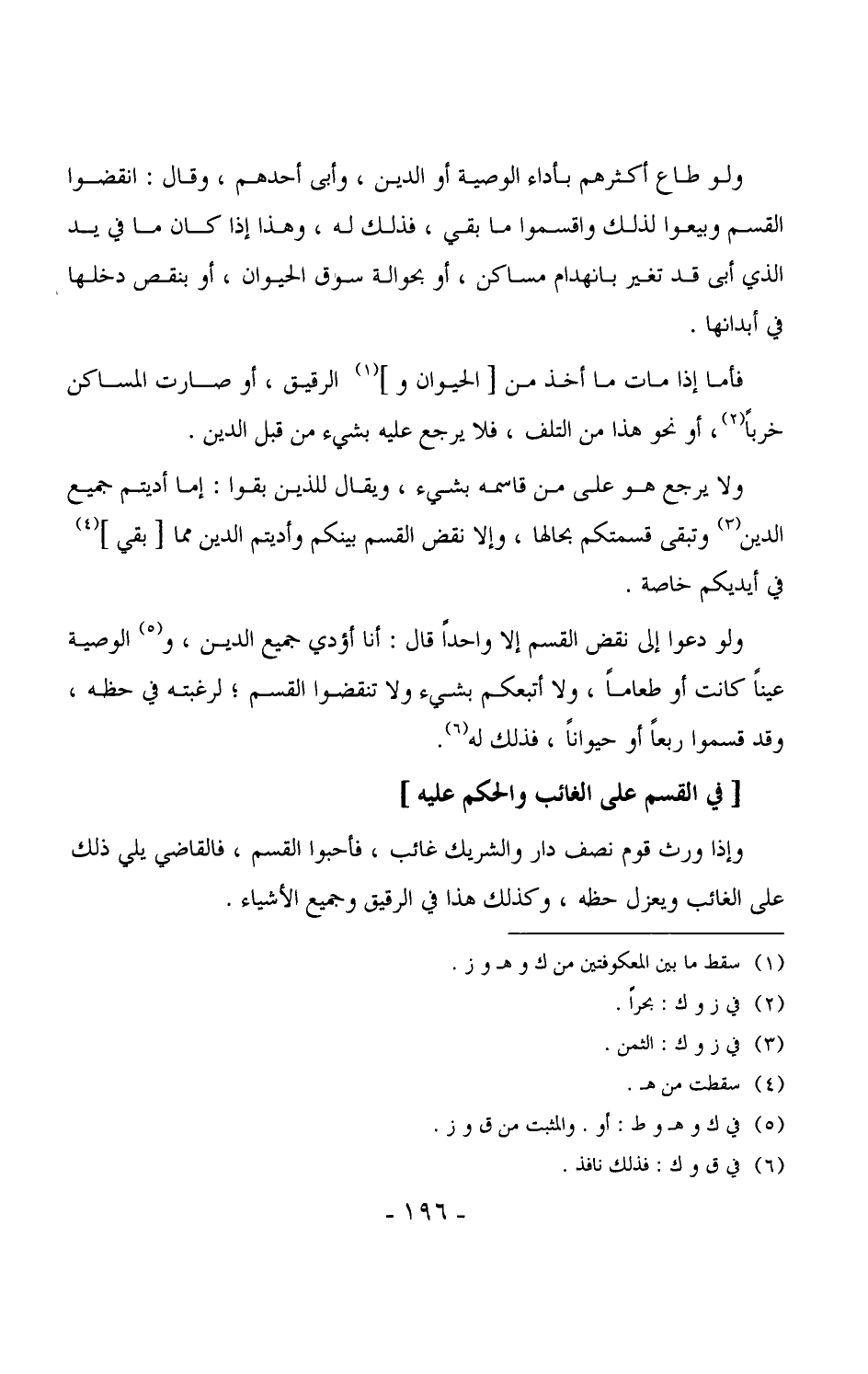 ولو طاع أكثرهم بأداء الوصية أو الدين، وأبى أحدهم، وقال: انقضوا القسم وبيعوا لذلك واقسموا ما بقي، فذلك له، وهذا إذا كان ما في يد الذي أبى قد تغير بانهدام مساكن، أو بحوالة سوق الحيوان، أو بنقص دخلها في أبدانها.