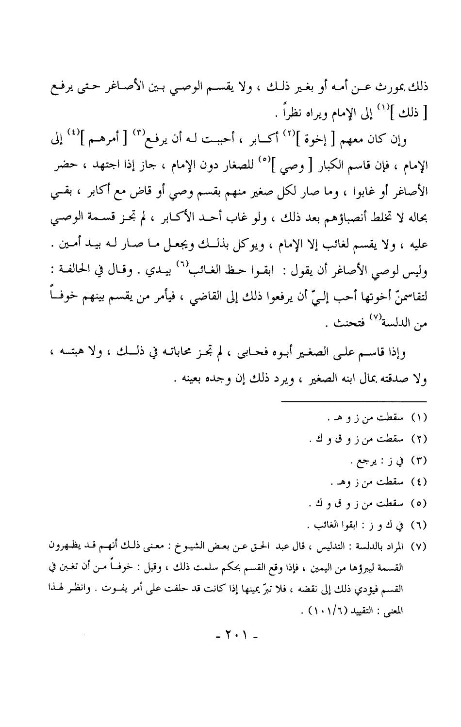 وإن كان معهم [إخوة] أكابر، أحببت له أن يرفع [أمرهم] إلى الإمام، فإن قاسم الكبار [وصي] للصغار دون الإمام، جاز إذا اجتهد، حضر الأصاغر أو غابوا، وما صار لكل صغير منهم بقسم وصي أو قاض مع أكابر، بقي بحاله لا تخلط أنصباؤهم بعد ذلك، ولو غاب أحد الأكابر، لم تجز قسمة الوصي عليه، ولا يقسم لغائب إلا الإمام، ويوكل بذلك ويجعل ما صار له بيد أمين. وليس لوصي الأصاغر أن يقول: ابقوا حظ الغائب بيدي. وقال في الجالفة: لتقاسمنّ أخوتها أحب إليّ أن يرفعوا ذلك إلى القاضي، فيأمر من يقسم بينهم خوفاً من الدلسة فتحنث.