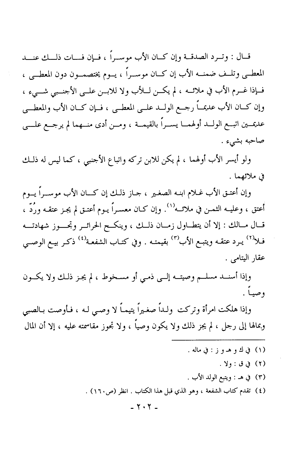 وإن أعتق الأب غلام ابنه الصغير، جاز ذلك إن كان الأب موسراً يوم أعتق، وعليه الثمن في ملائه. وإن كان معسراً يوم أعتق لم يجز عتقه ورُدّ، قال مالك: إلا أن يتطاول زمان ذلك، وينكح الحرائر وتجوز شهادته فلا يرد عتقه ويتبع الأب بقيمته. وفي كتاب الشفعة ذكر بيع الوصي عقار اليتامى. (¬1)