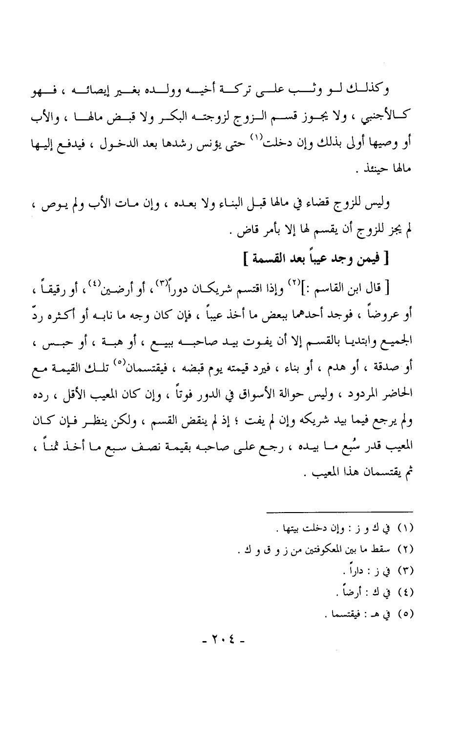 3715 -[قال ابن القاسم:] وإذا اقتسم شريكان دوراً، أو أرضين، أو رقيقاً، أو عروضاً، فوجد أحدهما ببعض ما أخذ عيباً، فإن كان وجه ما نابه أو أكثره ردّ الجميع وابتديا بالقسم إلا أن يفوت بيد صاحبه ببيع، أو هبة، أو حبس، أو صدقة، أو هدم، أو بناء، فيرد قيمته يوم قبضه، فيقتسمان تلك القيمة مع الحاضر المردود، وليس حوالة الأسواق في الدور فوتاً، وإن كان المعيب الأقل، رده ولم يرجع فيما بيد شريكه وإن لم يفت، إذ لم ينقض القسم، ولكن ينظر فإن كان المعيب قدر سُبع ما بيده، رجع على صاحبه بقيمة نصف سبع ما أخذ ثمناً، ثم يقتسمان هذا المعيب.
