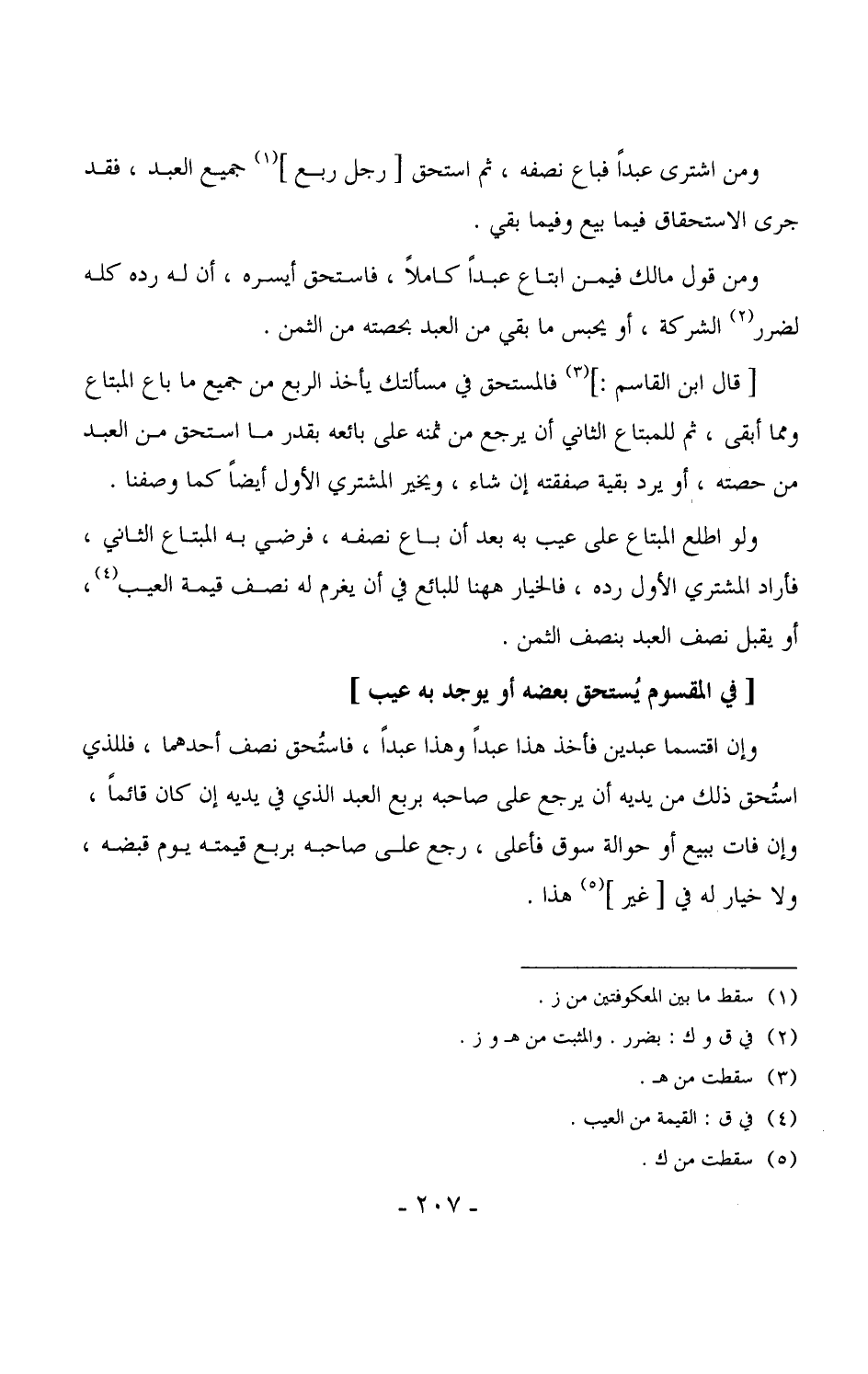 ومن قول مالك فيمن ابتاع عبداً كاملاً، فاستحق أيسره، أن له رده كله لضرر الشركة، أو يحبس ما بقي من العبد بحصته من الثمن.
