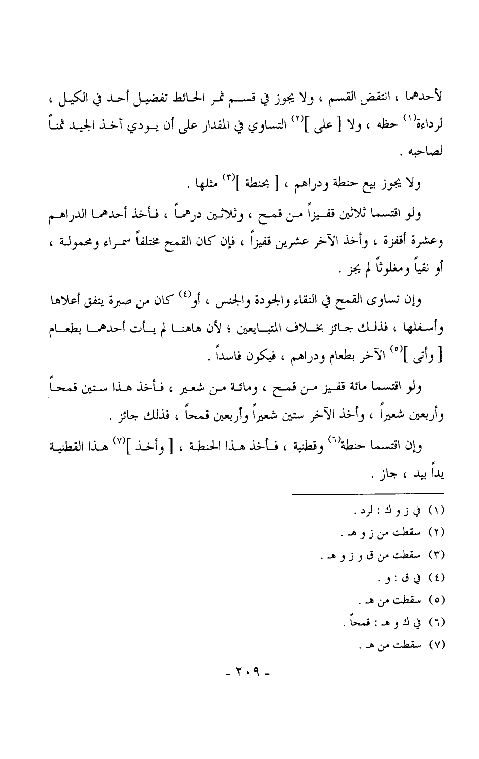 ولو اقتسما ثلاثين قفيزاً من قمح، وثلاثين درهماً، فأخذ أحدهما الدراهم وعشرة أقفزة، وأخذ الآخر عشرين قفيزاً، فإن كان القمح مختلفاً سمراء ومحمولة، أو نقياً ومغلوثاً لم يجز.