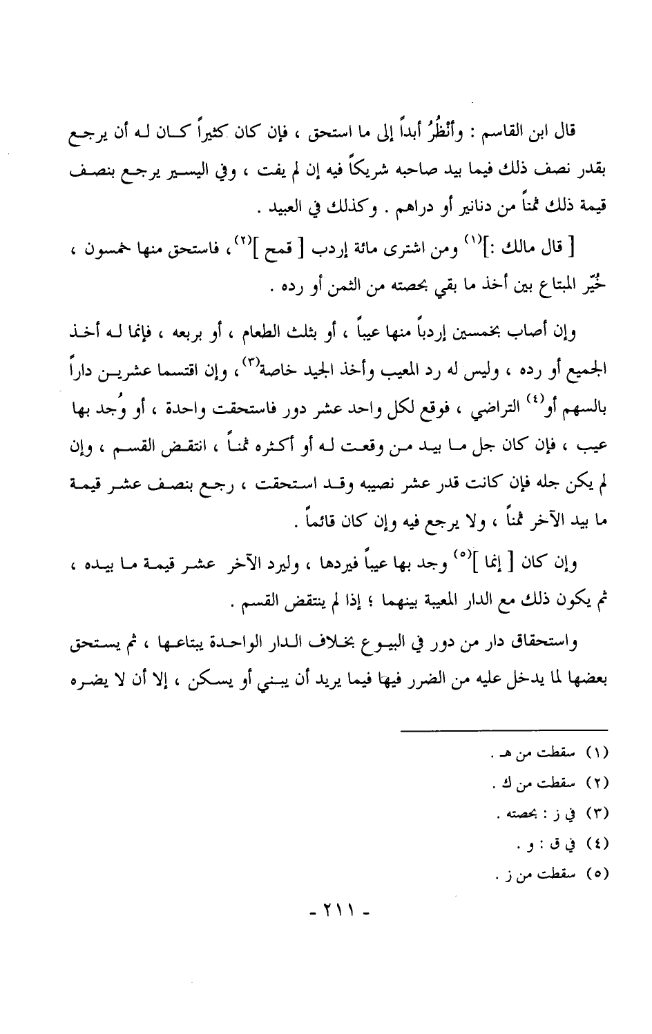 وإن أصاب بخمسين إردباً منها عيباً، أو بثلث الطعام، أو بربعه، فإنما له أخذ الجميع أو رده، وليس له رد المعيب وأخذ الجيد خاصة، وإن اقتسما عشرين داراً بالسهم أو التراضي، فوقع لكل واحد عشر دور فاستحقت واحدة، أو وُجد بها عيب، فإن كان جل ما بيد من وقعت له أو أكثره ثمناً، انتقض القسم، وإن لم يكن جله فإن كانت قدر عشر نصيبه وقد استحقت، رجع بنصف عشر قيمة ما بيد الآخر ثمناً، ولا يرجع فيه وإن كان قائماً.