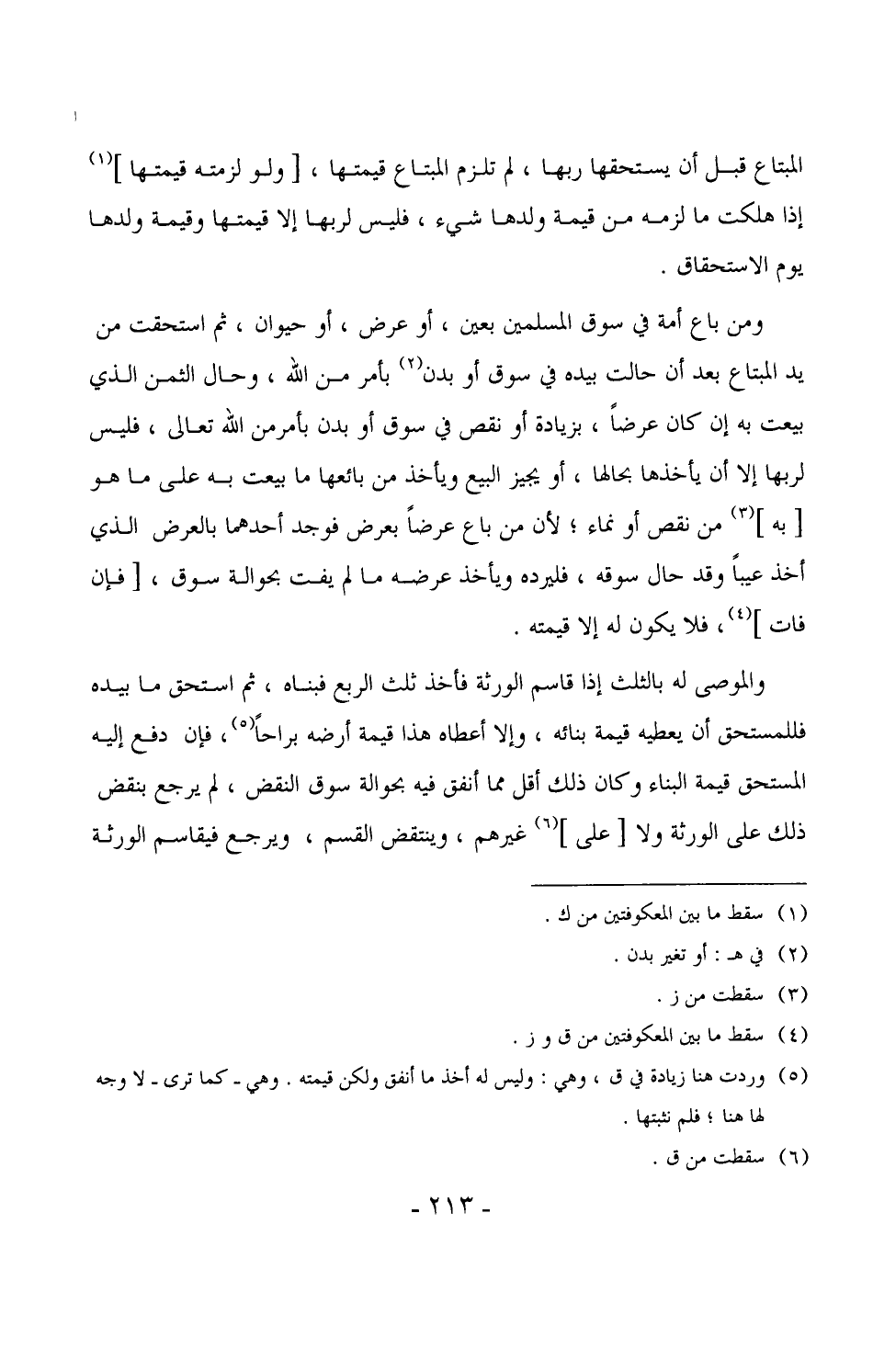 ومن باع أمة في سوق المسلمين بعين، أو عرض، أو حيوان، ثم استحقت من يد المبتاع بعد أن حالت بيده في سوق أو بدن بأمر من الله، وحال الثمن الذي بيعت به إن كان عرضاً، بزيادة أو نقص في سوق أو بدن بأمر من الله تعالى، فليس لربها إلا أن يأخذها بحالها، أو يجيز البيع ويأخذ من بائعها ما بيعت به على ما هو [به] من نقص أو نماء، لأن من باع عرضاً بعرض فوجد أحدهما بالعرض الذي أخذ عيباً وقد حال سوقه، فليرده ويأخذ عرضه ما لم يفت بحوالة سوق، [فإن فات] ، فلا يكون له إلا قيمته.