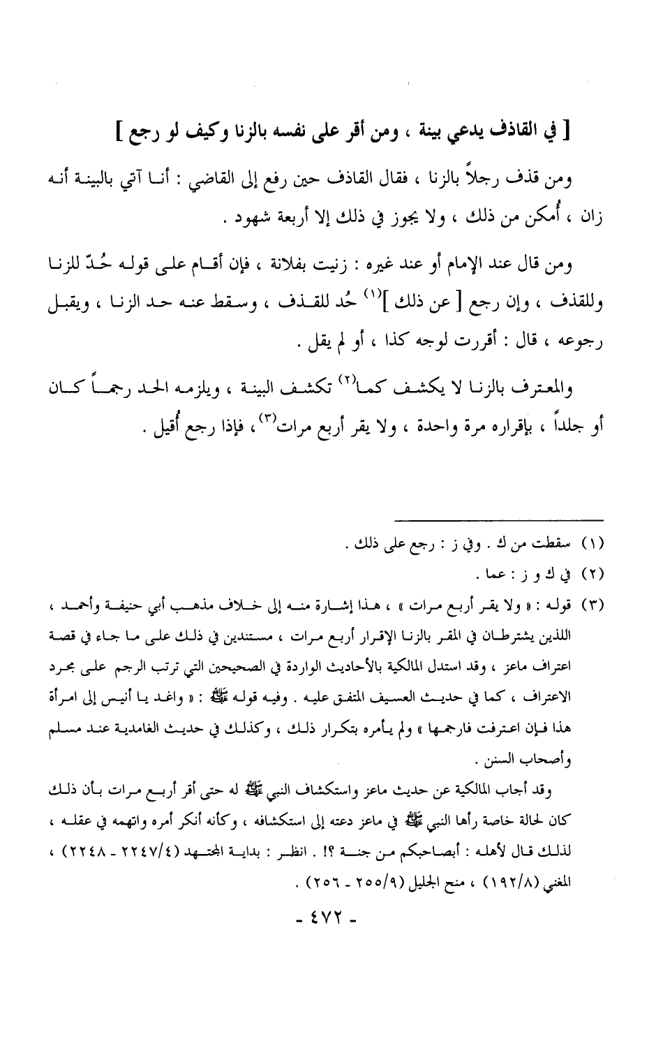 والمعترف بالزنا لا يكشف كما تكشف البينة، ويلزمه الحد رجماً كان أو جلداً، بإقراره مرة واحدة، ولا يقر أربع مرات، فإذا رجع أُقيل.