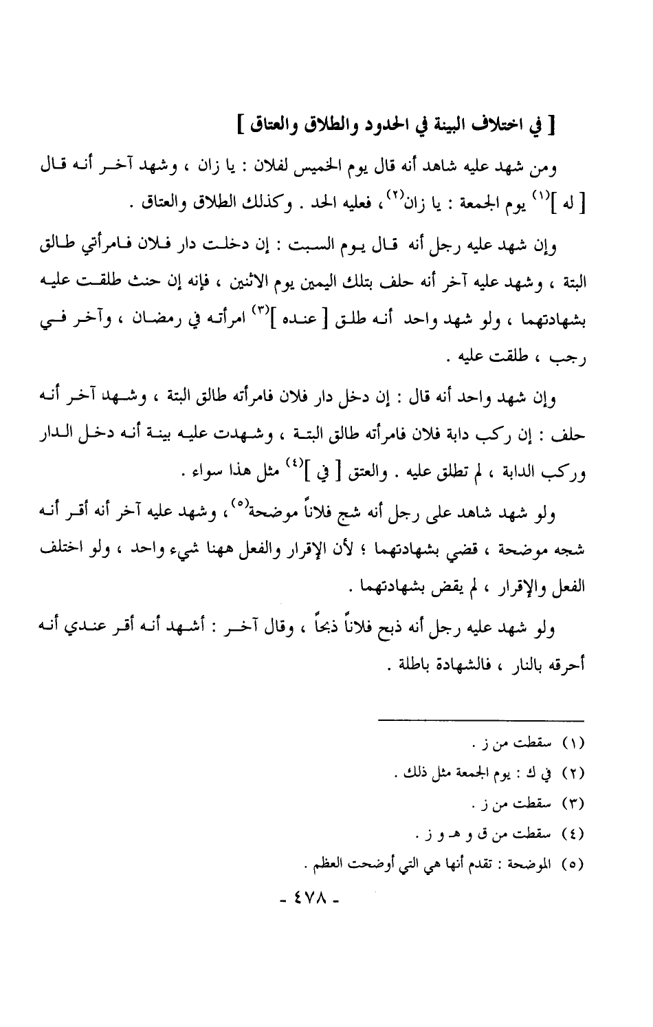4080 - ومن شهد عليه شاهد أنه قال يوم الخميس لفلان: يا زان، وشهد آخر أنه قال [له] يوم الجمعة: يا زان، فعليه الحد. وكذلك الطلاق والعتاق.