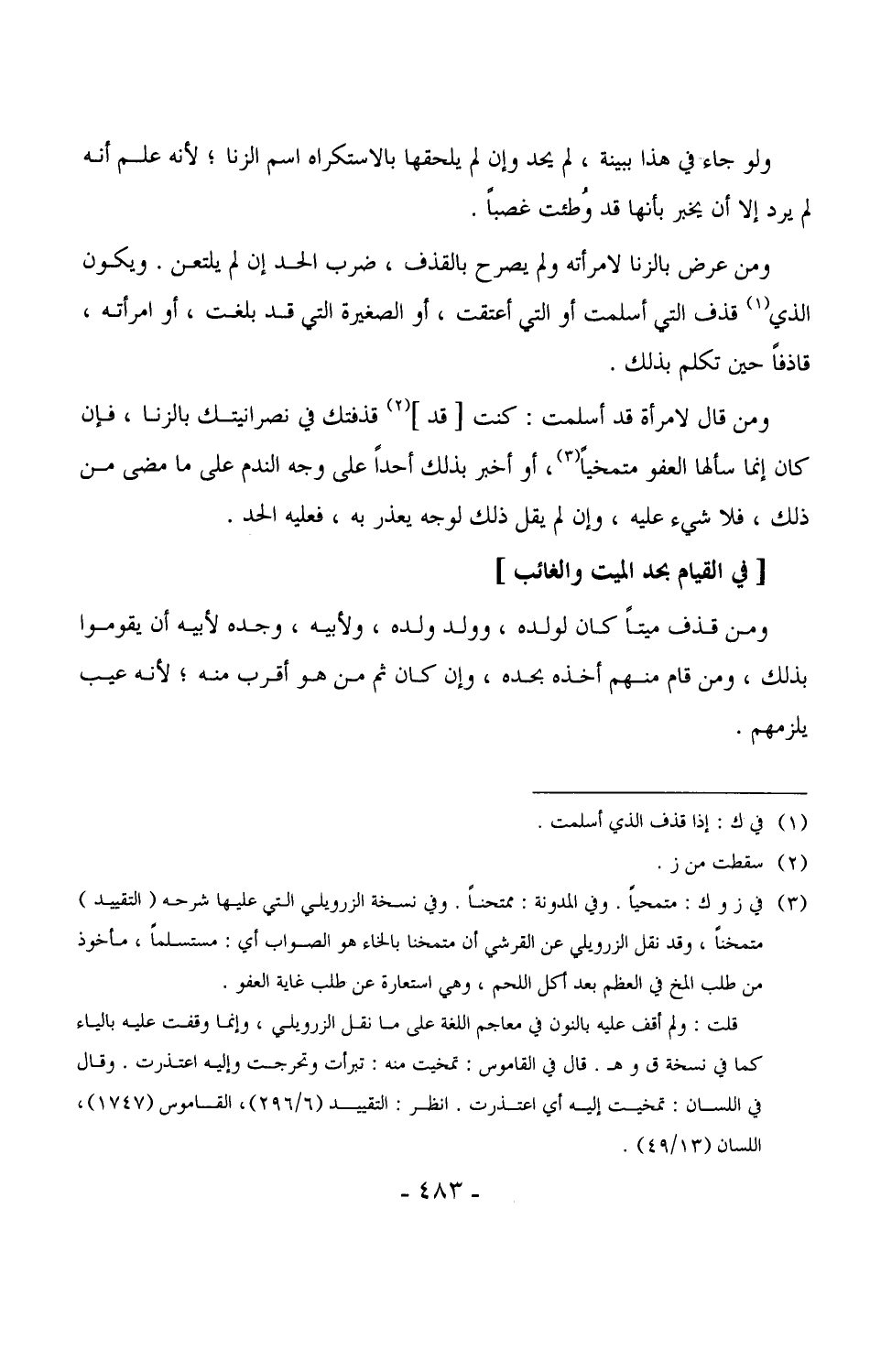 4091 - ومن قذف ميتاً كان لولده، وولد ولده، ولأبيه، وجده لأبيه أن يقوموا بذلك، ومن قام منهم أخذه بحده، وإن كان ثم من هو أقرب منه، لأنه عيب يلزمهم. (¬1)