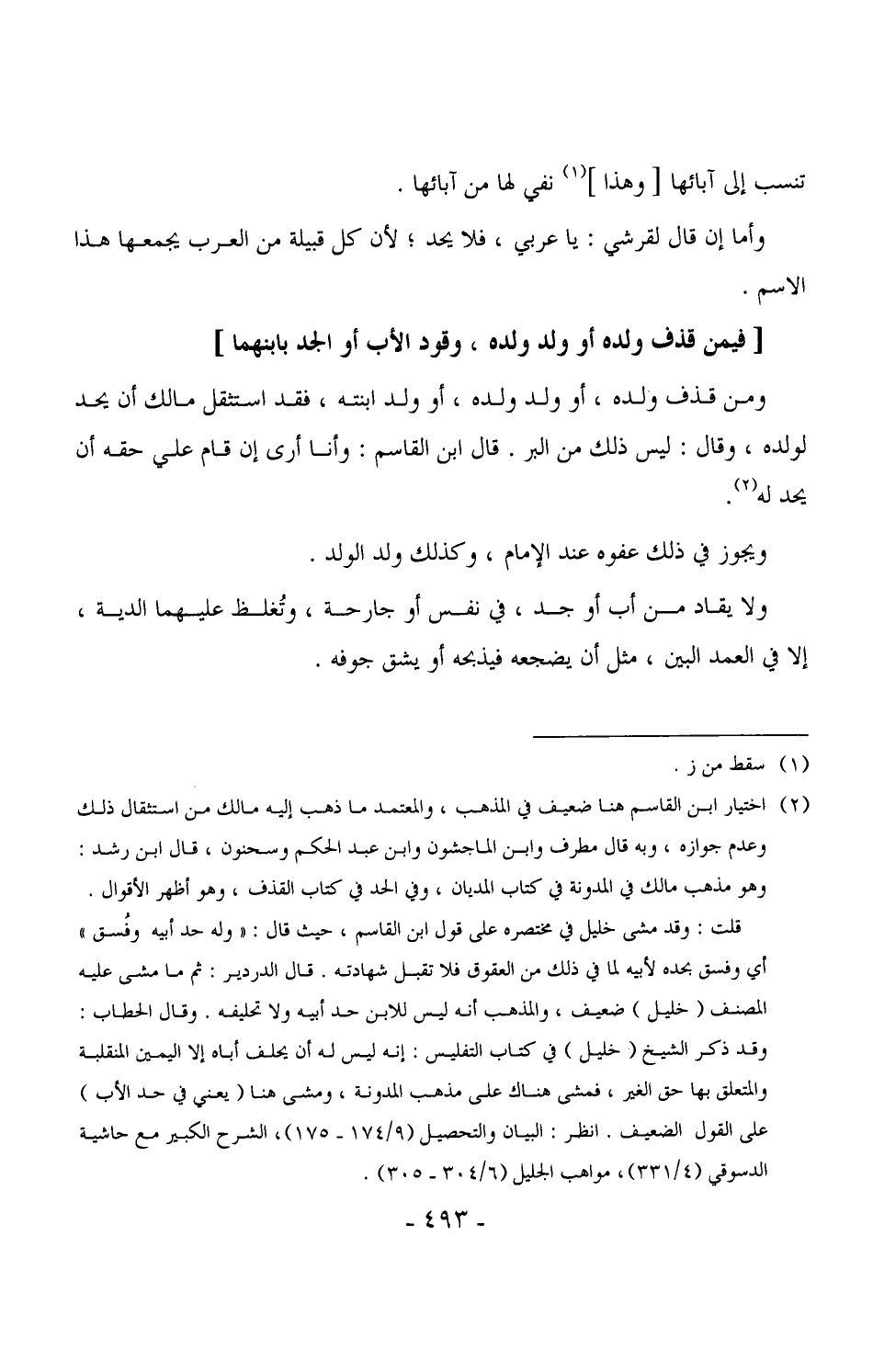 4105 - ومن قذف ولده، أو ولد ولده، أو ولد ابنته، فقد استثقل مالك أن يحد لولده، وقال: ليس ذلك من البر. قال ابن القاسم: وأنا أرى إن قام على حقه أن يحد له.