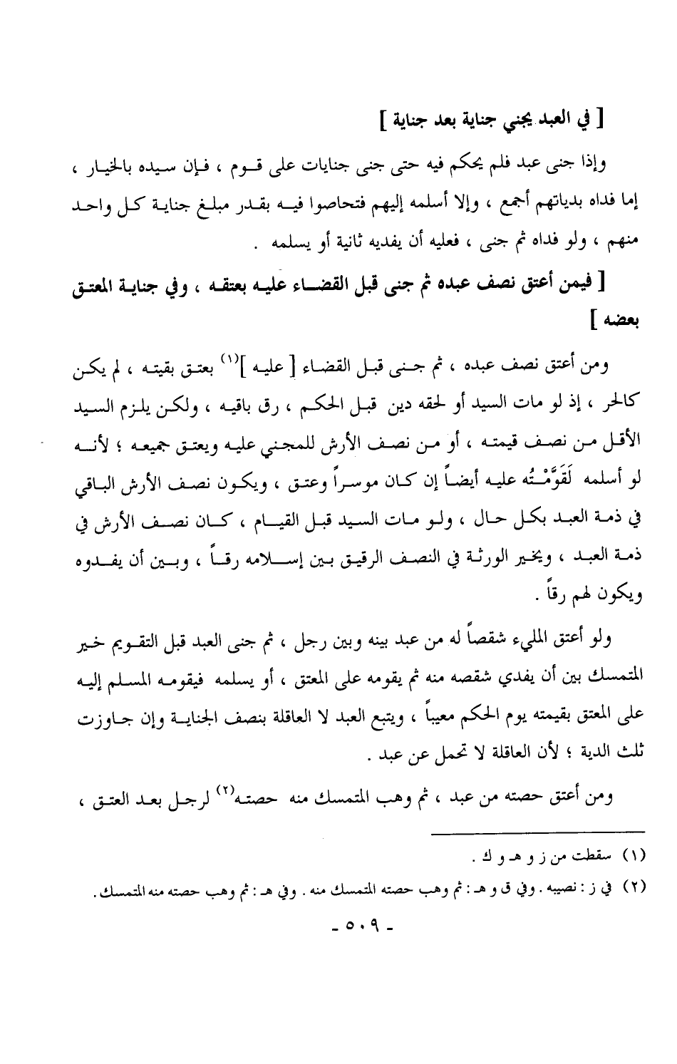 ولو أعتق المليء شقصاً له من عبد بينه وبين رجل، ثم جنى العبد قبل التقويم خير المتمسك بين أن يفدي شقصه منه ثم يقومه على المعتق، أو يسلمه فيقومه المسلم إليه على المعتق بقيمته يوم الحكم معيباً، ويتبع العبد لا العاقلة بنصف الجناية وإن جاوزت ثلث الدية، لأن العاقلة لا تحمل عن عبد. (¬1)