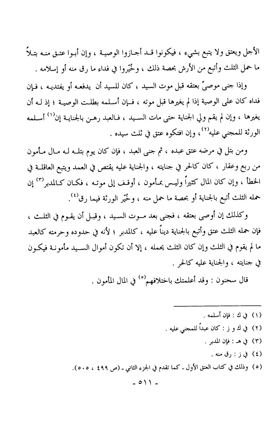 4130 - ومن بتل في مرضه عتق عبده، ثم جنى العبد، فإن كان يوم بتله له مال مأمون من ربع وعقار، كان كالحر في جنايته، والجناية عليه يقتص في العمد ويتبع العاقلة في الخطأ، وإن كان المال كثيراً وليس بمأمون، أوقف إلى موته، فكان كالمدبر إن حمله الثلث أتبع بالجناية أو بحصة ما حمل منه، وخُيّر الورثة فيما رق.
