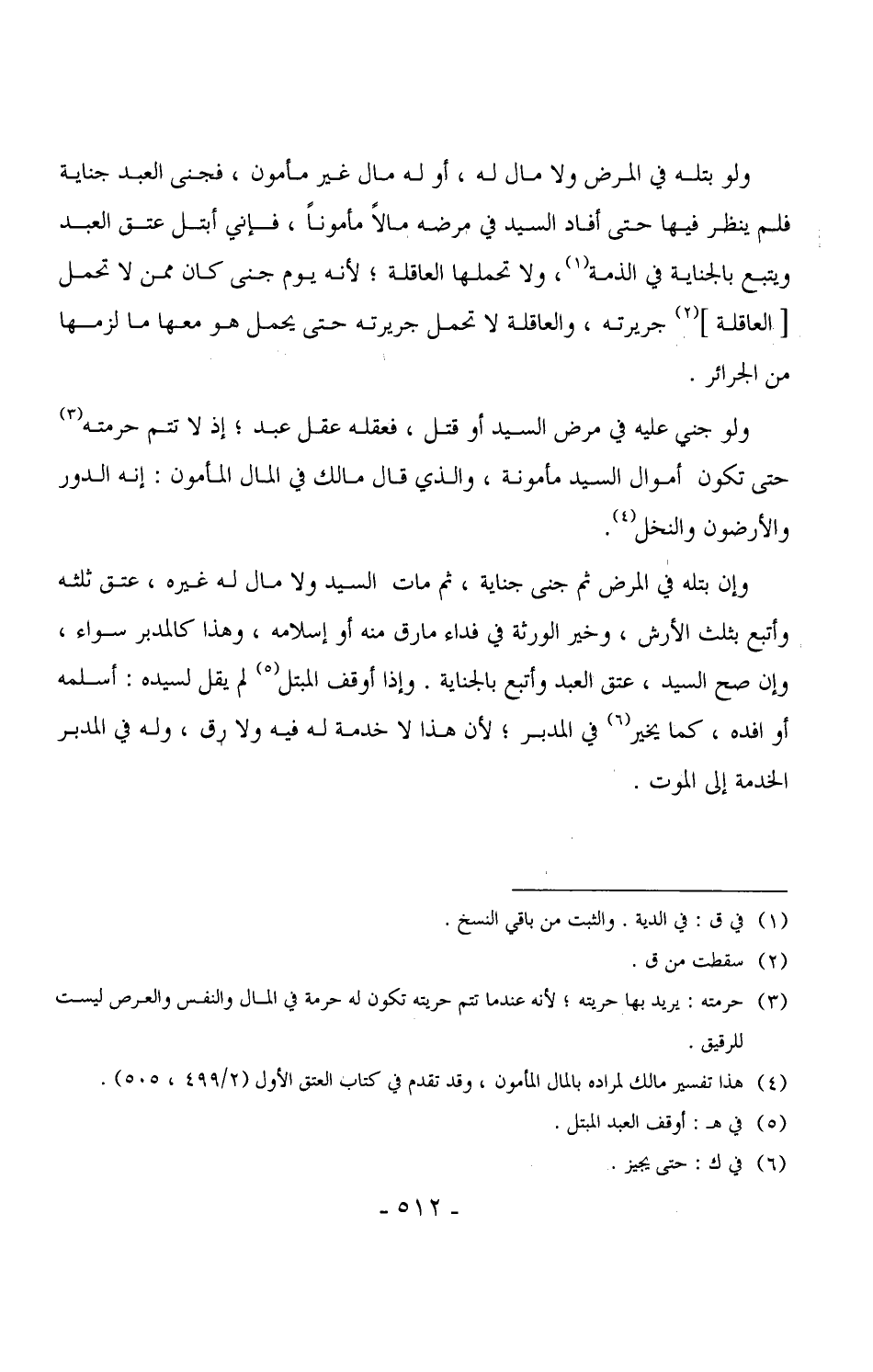 4131 - ولو جني عليه في مرض السيد أو قتل، فعقله عقل عبد، إذ لا تتم حرمته حتى تكون أموال السيد مأمونة، والذي قال مالك في المال المأمون: إنه الدور والأرضون والنخل.