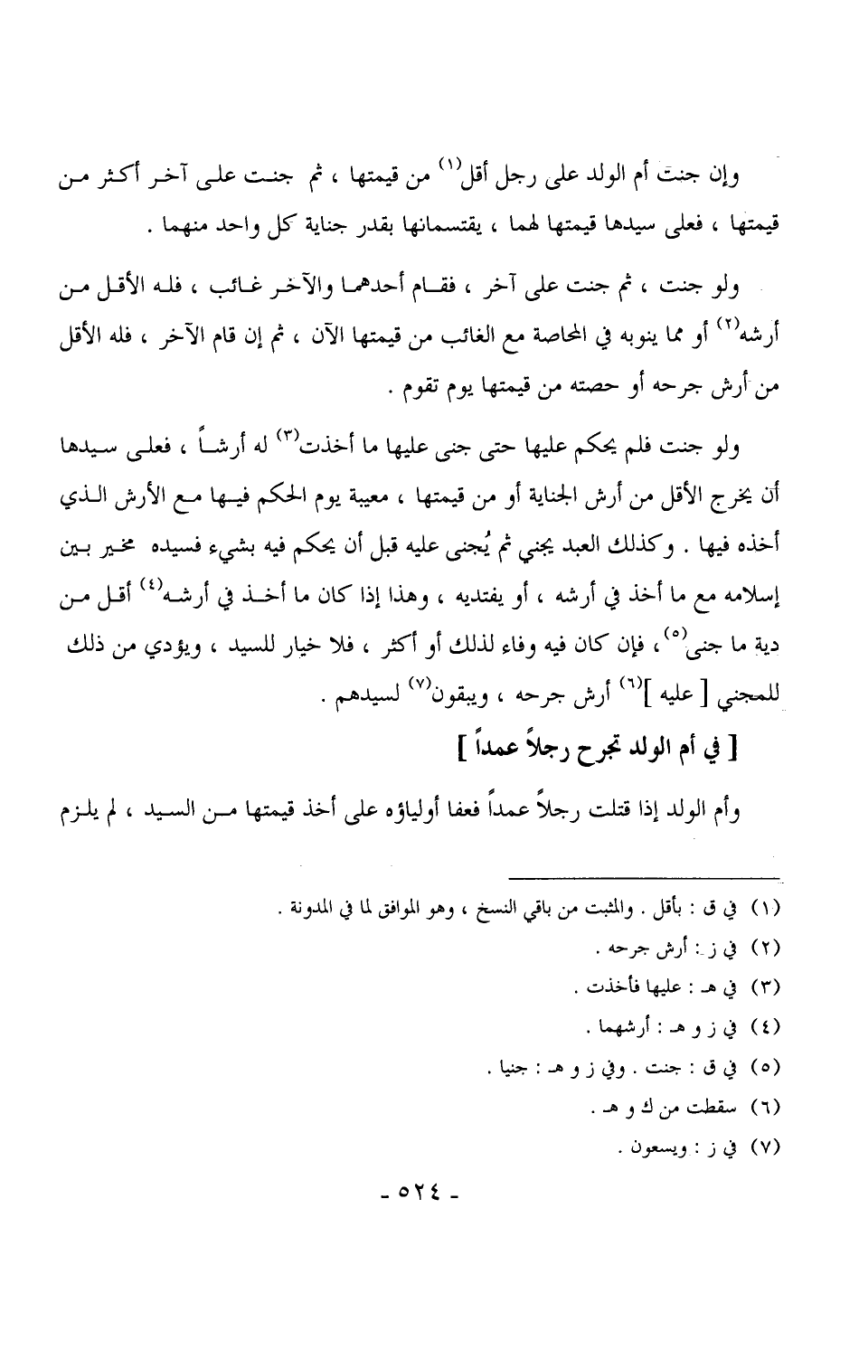 4143 - وإن جنت أم الولد على رجل أقل من قيمتها، ثم جنت على آخر أكثر من قيمتها، فعلى سيدها قيمتها لهما، يقتسمانها بقدر جناية كل واحد منهما.