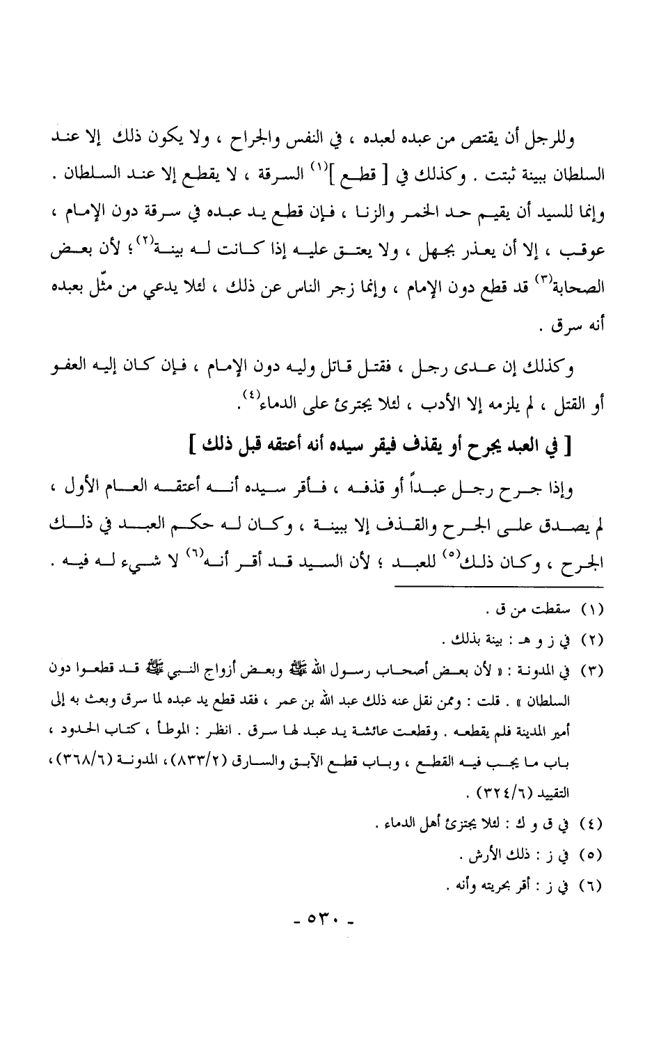 وللرجل أن يقتص من عبده لعبده، في النفس والجراح، ولا يكون ذلك إلا عند السلطان ببينة ثبتت. وكذلك في [قطع] السرقة، لا يقطع إلا عند السلطان. وإنما للسيد أن يقيم حد الخمر والزنا، فإن قطع يد عبده في سرقة دون الإمام، عوقب، إلا أن يعذر بجهل، ولا يعتق عليه إذا كانت له بينة، لأن بعض الصحابة قد قطع دون الإمام، وإنما زجر الناس عن ذلك، لئلا يدعي من مثّل بعبده أنه سرق.