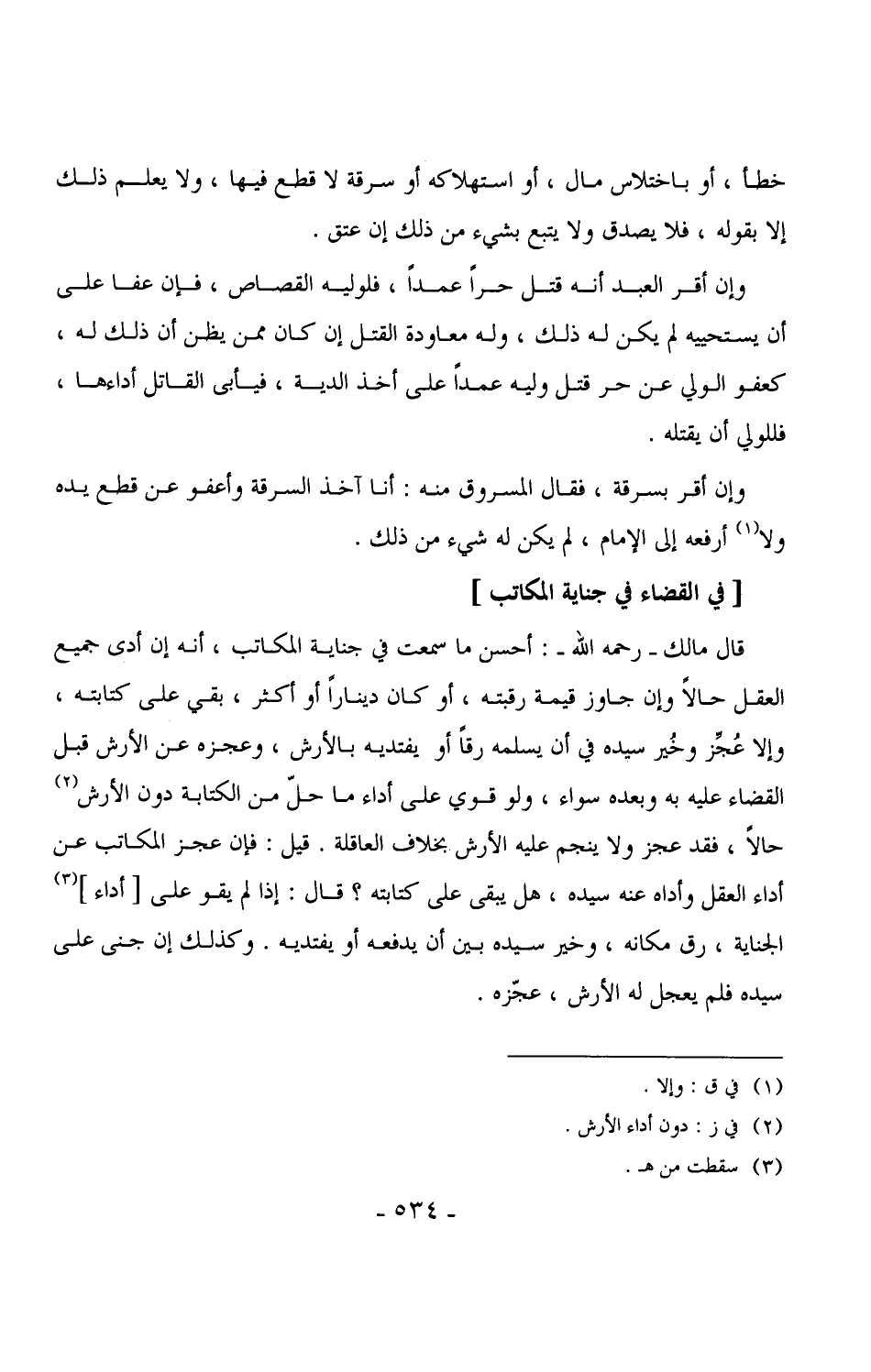 4156 - قال مالك - رحمه الله -: أحسن ما سمعت في جناية المكاتب، أنه إن أدى جميع العقل حالاً وإن جاوز قيمة رقبته، أو كان ديناراً أو أكثر، بقي على كتابته، وإلا عُجِّز وخُير سيده في أن يسلمه رقاً أو يفتديه بالأرش، وعجزه عن الأرش قبل القضاء عليه به وبعده سواء، ولو قوي على أداء ما حلّ من الكتابة دون الأرش حالاً، فقد عجز ولا ينجم عليه الأرش بخلاف العاقلة. قيل: فإن عجز المكاتب عن أداء العقل وأداه عنه سيده، هل يبقى علة كتابته؟ قال: إذا لم يقو على [أداء] الجناية، رق مكانه، وخير سيده بين أن يدفعه أو يفتديه. وكذلك إن جنى على سيده فلم يعجل له الأرش، عجّزه.
