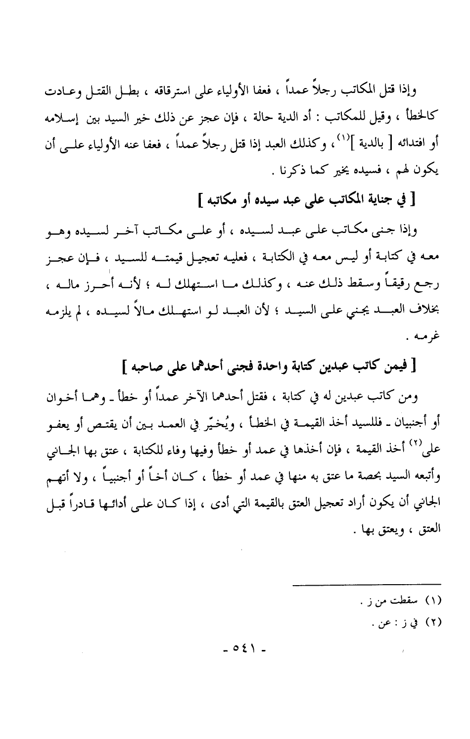 4167 - ومن كاتب عبدين له في كتابة، فقتل أحدهما الآخر عمداً أو خطأ - وهما أخوان أو أجنبيان - فللسيد أخذ القيمة في الخطأ، ويُخيّر في العمد بين أن يقتص أو يعفو على أخذ القيمة، فإن أخذها في عمد أو خطأ وفيها وفاء للكتابة، عتق بها الجاني وأتبعه السيد بحصة ما عتق به منها في عمد أو خطأ، كان أخاً أو أجنبياً، ولا أتهم الجاني أن يكون أراد تعجيل العتق بالقيمة التي أدى، إذا كان على أدائها قادراً قبل العتق، ويعتق بها.