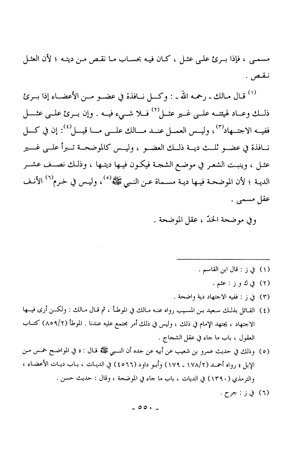4183 - قال مالك - رحمه الله -: وكل نافذة في عضو من الأعضاء إذا برئ ذلك وعاد لهيئته على غير عثل فلا شيء فيه. وإن برئ على عثل ففيه الاجتهاد، وليس العمل عند مالك على ما قيل: إن في كل نافذة في عضو ثلث دية ذلك العضو، وليس كالموضحة تبرأ على غير عثل، وينبت الشعر في موضع الشجة فيكون فيها ديتها، وذلك نصف عشر الدية، لأن الموضحة فيها دية مسماة عن النبي ÷، وليس في خرم الأنف عقل مسمى.