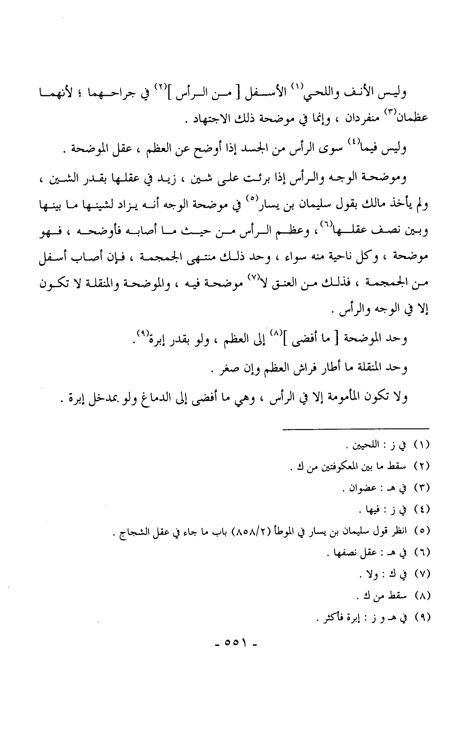 وموضحة الوجه والرأس إذا برئت على شين، زيد في عقلها بقدر الشين، ولم يأخذ مالك بقول سليمان بن يسار في موضحة الوجه أنه يزاد لشينها ما بينها وبين نصف عقلها، وعظم الرأس من حيث ما أصابه فأوضحه، فهو موضحة، وكل ناحية منه سواء، وحد ذلك منتهى الجمجمة، فإن أصاب أسفل من الجمجمة، فذلك من العنق لا موضحة فيه، والموضحة والمنقلة لا تكون إلا في الوجه والرأس.