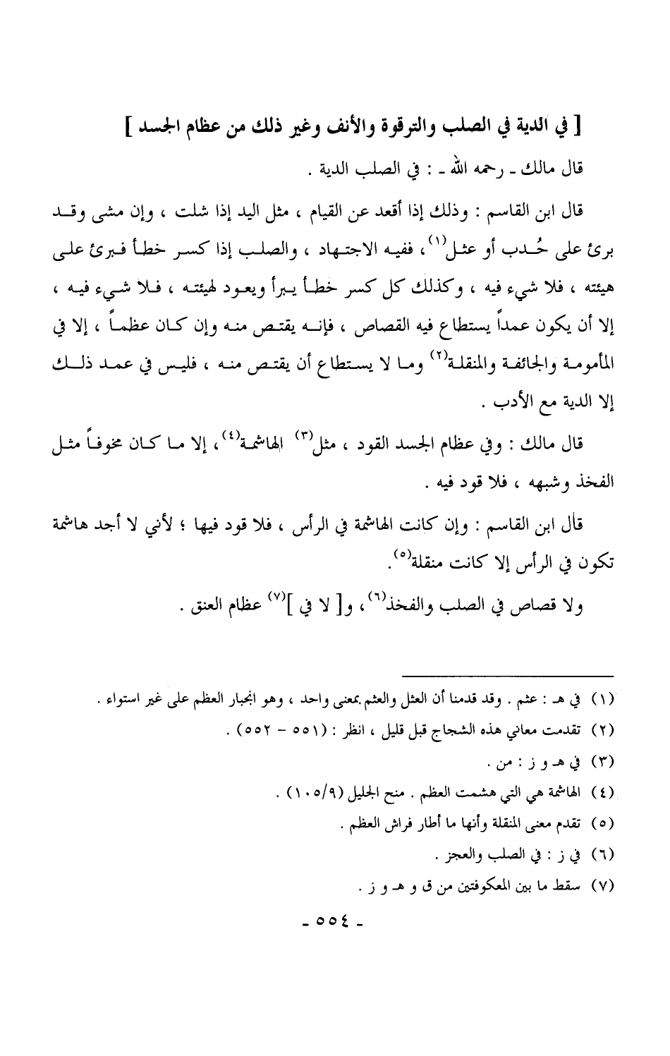 قال ابن القاسم: وذلك إذا أقعد عن القيام، مثل اليد إذا شلت، وإن مشى وقد برئ على حُدب أو عثل، ففيه الاجتهاد، والصلب إذا كسر خطأ فبرئ على هيئته، فلا شيء فيه، وكذلك كل كسر خطأ يبرا ويعود لهيئته، فلا شيء فيه، إلا أن يكون عمداً يستطاع فيه القصاص، فإنه يقتص منه وإن كان عظماً، إلا في المأمومة والجائفة والمنقلة وما لا يستطاع أن يقتص منه، فليس في عمد ذلك إلا الدية مع الأدب.
