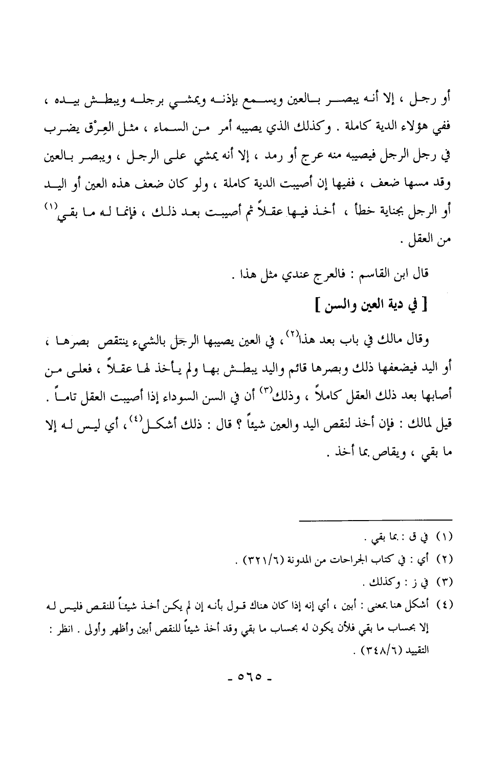 أو رجل، إلا أنه يبصر بالعين ويسمع بإذنه ويمشي برجله ويبطش بيده، ففي هؤلاء الدية كاملة. وكذلك الذي يصيبه أمر من السماء، مثل العِرْق يضرب في رجل الرجل فيصيبه منه عرج أو رمد، غلا أنه يمشي على الرجل، ويبصر بالعين وقد مسها ضعف، ففيها إن أصيبت الدية كاملة، ولو كان ضعف هذه العين أو اليد أو الرجل بجناية خطأ، أخذ فيها عقلاً ثم أصيبت بعد ذلك، فإنما له ما بقي من العقل.