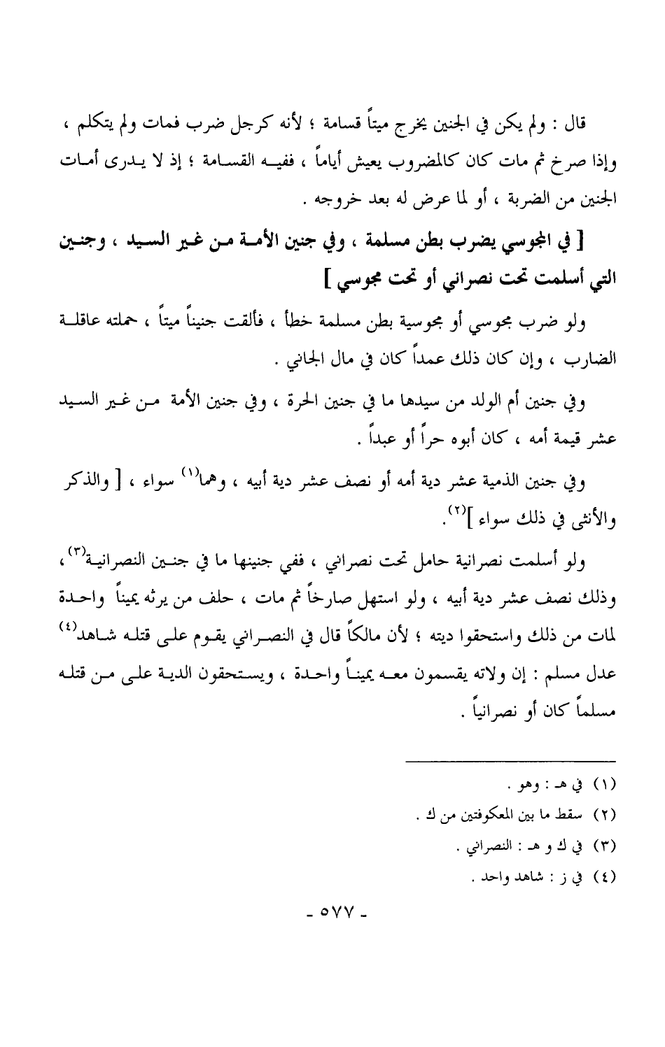 4504 - ولو ضرب مجوسي أو مجوسية بطن مسلمة خطأ، فألقت جنيناً ميتاً، حملته عاقلة الضارب، وإن كان ذلك عمداً كان في مال الجاني.