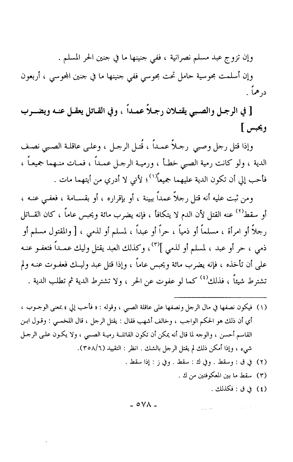 ومن ثبت عليه أنه قتل رجلاً عمداً ببينة، أو بإقراره، أو بقسامة، فعفي عنه، أو سقط عنه القتل لأن الدم لا يتكافأ، فإنه يضرب مائة ويحبس عاماً، كان القاتل رجلاً أو امرأة، مسلماً أو ذمياً، حراً أو عبداً، لمسلم أو لذمي، [والمقتول مسلم أو ذمي، حر أو عبد، لمسلم أو لذمي] ، وكذلك العبد يقتل وليك عمداً فتعفو عنه على أن تأخذه، فإنه يضرب مائة ويحبس عاماً، وإذا قتل عبد وليك فعفوت عنه ولم تشترط شيئاً، فذلك كما لو عفوت عن الحر، ولا تشترط الدية ثم تطلب الدية.