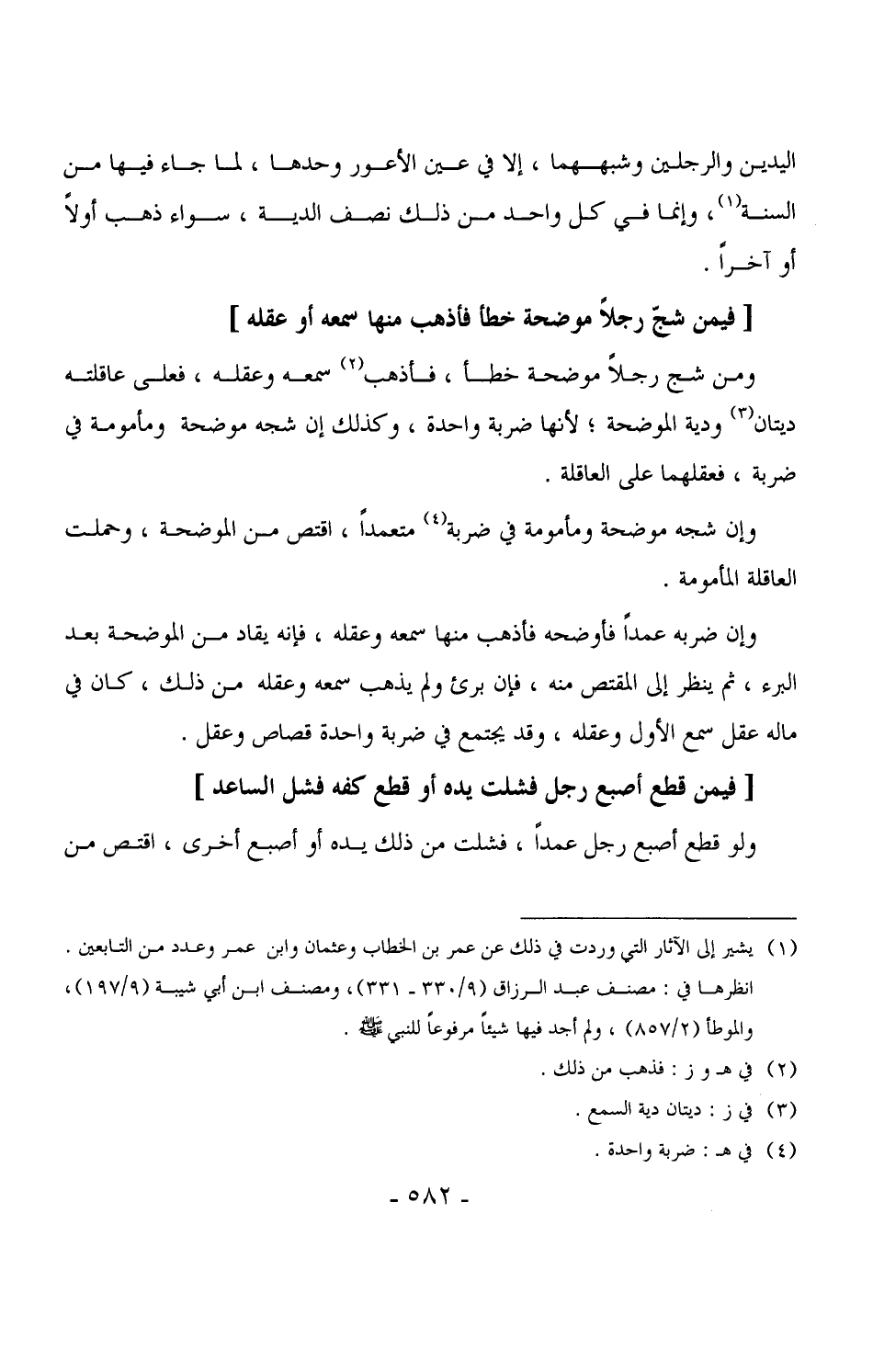 4510 - ومن شجّ رجلاً موضحة خطأ، فأذهب سمعه وعقله، فعلى عاقلته ديتان ودية الموضحة، لأنها ضربة واحدة، وكذلك إن شجه موضحة ومأمومة في ضربة، فعقلهما على العاقلة.