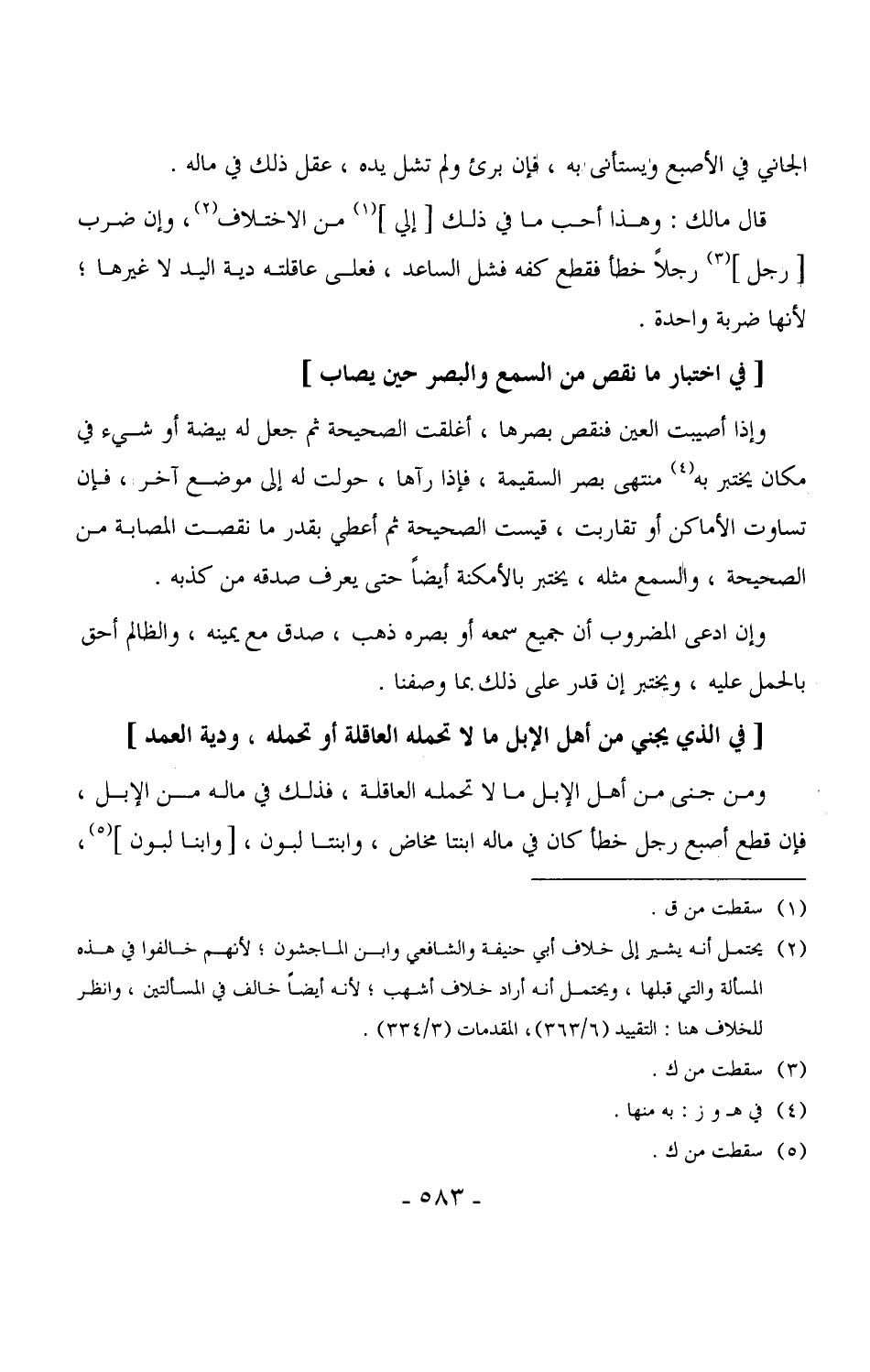 4512 - وإذا أصيبت العين فنقص بصرها، أغلقت الصحيحة ثم جعل له بيضة أو شيء في مكان يختبر به منتهى بصر السقيمة، فإذا رآها، حولت له إلى موضع آخر، فإن تساوت الأماكن أو تقاربت، قيست الصحيحة ثم أعطي بقدر ما نقصت المصابة من الصحيحة، والسمع مثله، يختبر بالأمكنة أيضاً حتى يعرف صدقه من كذبه.