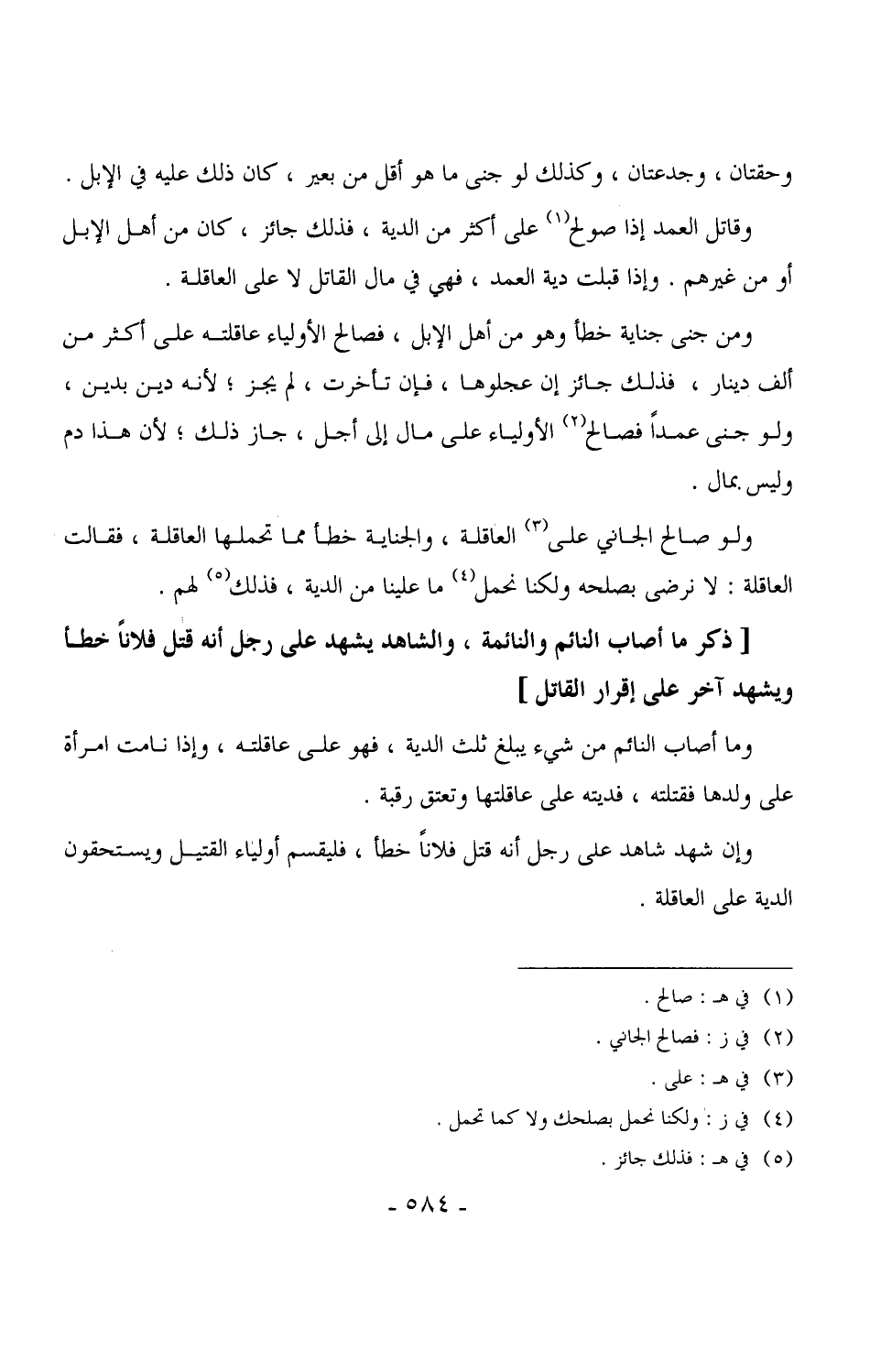 ومن جنى جناية خطأ وهو من أهل الإبل، فصالح الأولياء عاقلته على أكثر من ألف دينار، فذلك جائز إن عجلوها، فإن تأخرت، لم يجز، لأنه دين بدين، ولو جنى عمداً فصالح الأولياء على مال إلى أجل، جاز ذلك، لأن هذا دم وليس بمال.