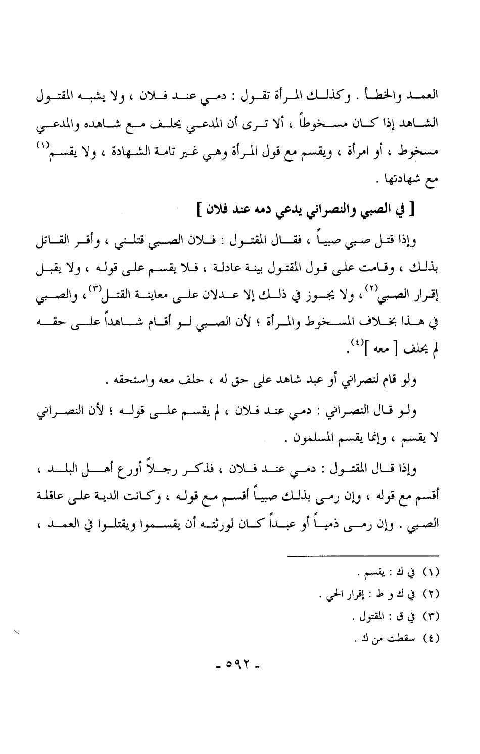 4523 - وإذا قتل صبي صبياً، فقال المقتول: فلان الصبي قتلني، وأقر القاتل بذلك، وقامت على قول المقتول بينة عادلة، فلا يقسم على قوله، ولا يقبل إقرار الصبي، ولا يجوز في ذلك إلا عدلان على معاينة القتل، والصبي في هذا بخلاف المسخوط والمرأة، لأن الصبي لو أقام شاهداً على حقه لم يحلف [معه] . (¬1)