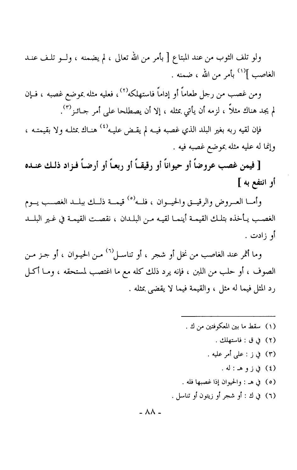 3544 - وأما العروض والرقيق والحيوان، فله قيمة ذلك ببلد الغصب يوم الغصب يأخذه بتلك القيمة أينما لقيه من البلدان، نقصت القيمة في غير البلد أو زادت.