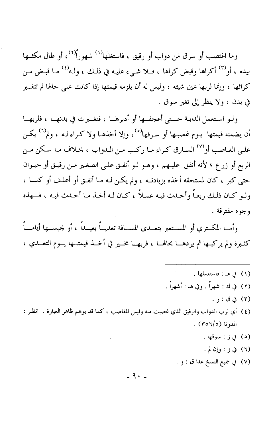 3546 - وما اغتصب أو سرق من دواب أو رقيق، فاستغلها شهوراً، أو طال مكثها بيده، أو أكراها وقبض كراها، فلا شيء عليه في ذلك، وله ما قبض من كرائها، وإنما لربها عين شيئه، وليس له أن يلزمه قيمتها إذا كانت على حالها لم تتغير في بدن، ولا ينظر إلى تغير سوق.