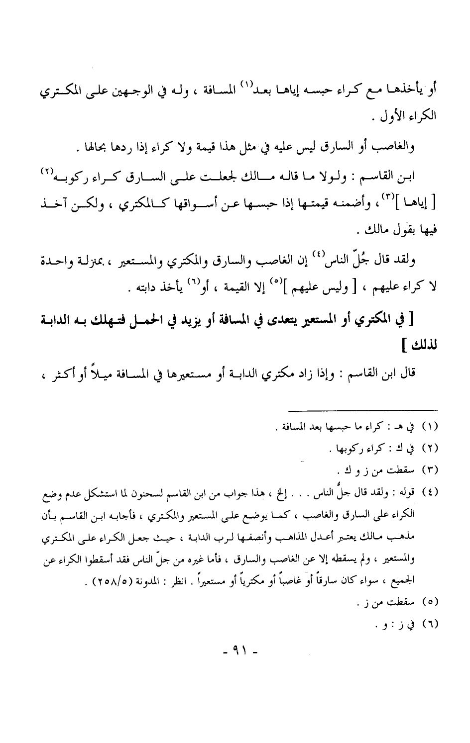 ولقد قال جُلّ الناس إن الغاصب والسارق والمكتري والمستعير، بمنزلة واحدة لا كراء عليهم، [وليس عليهم] إلا القيمة، أو يأخذ دابته.