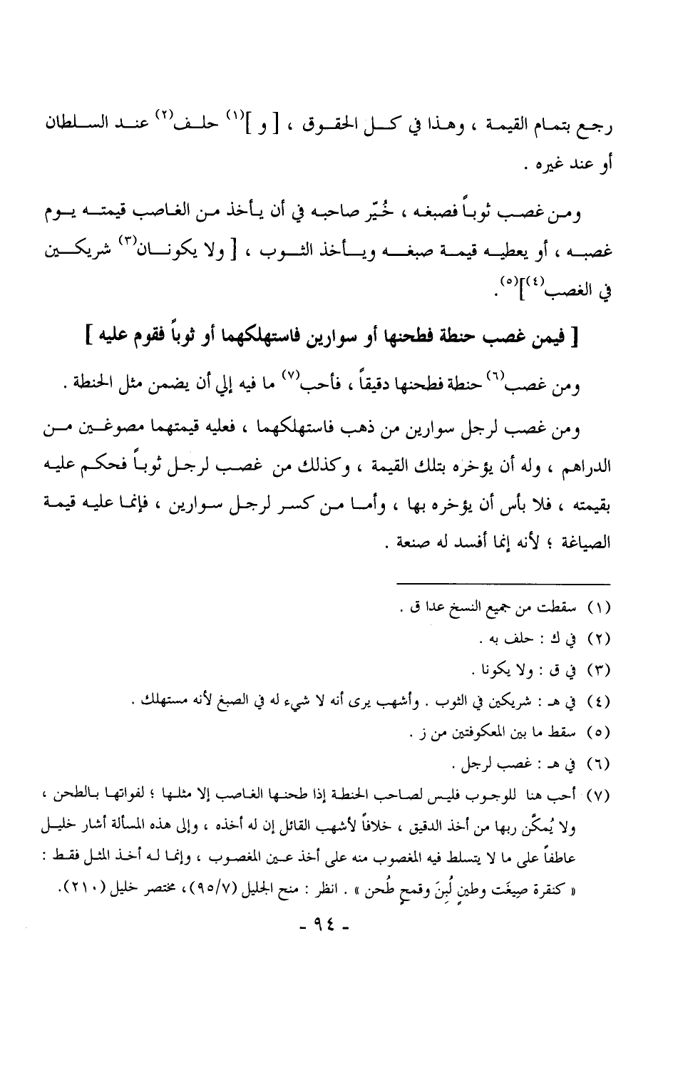 3553 - ومن غصب ثوباً فصبغه، خُيّر صاحبه في أن يأخذ من الغاصب قيمته يوم غصبه، أو يعطيه قيمة صبغه ويأخذ الثوب، [ولا يكونان شريكين في الغصب] .