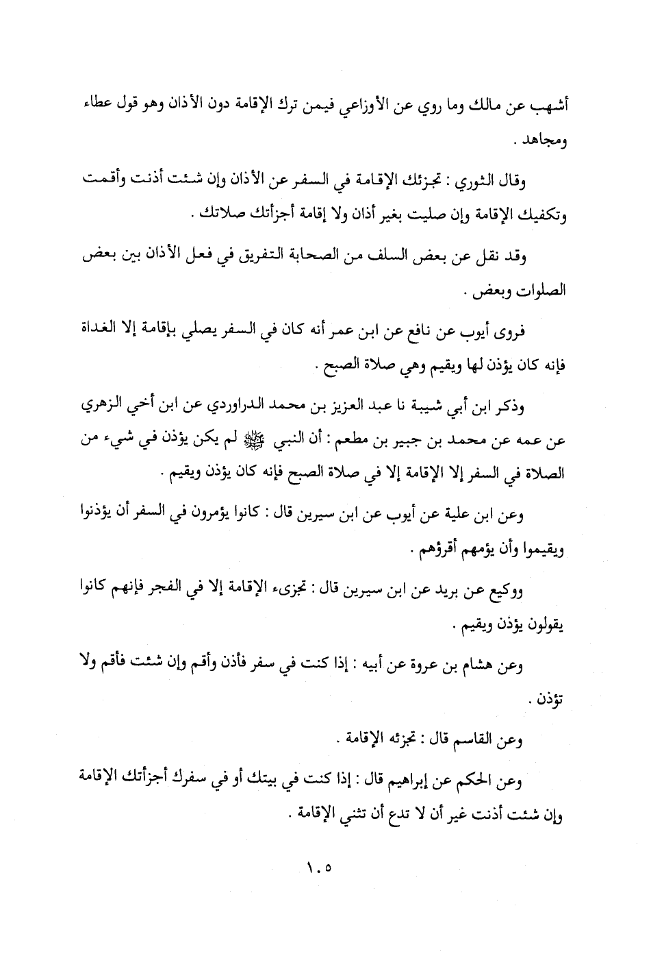 وذكر ابن أبي شيبة نا عبد العزيز بن محمد الدراوردي عن ابن أخي الزهري عن عمه عن محمد بن جبير بن مطعم: أن النبي - صلى الله عليه وسلم - لم يكن يؤذن في شيء من الصلاة في السفر إلا الإقامة إلا في صلاة الصبح فإنه كان يؤذن ويقيم.