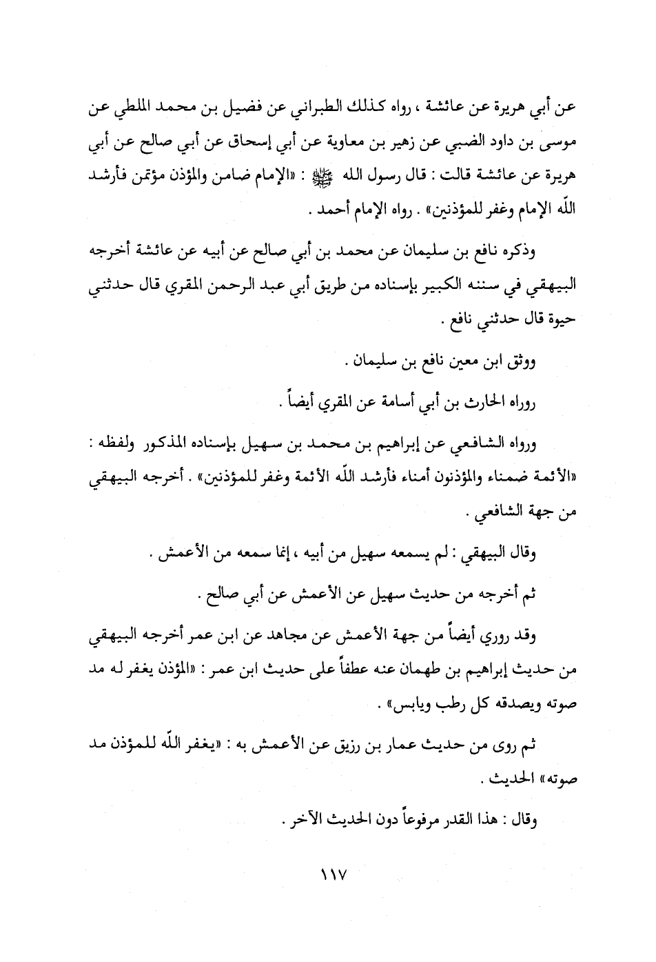 عن أبي هريرة عن عائشة، رواه كذلك الطبراني عن فضيل بن محمد الملطي عن موسى بن داود الضبي عن زهير بن معاوية عن أبي إسحاق عن أبي صالح عن أبي هريرة عن عائشة قالت: قال رسول الله - صلى الله عليه وسلم -: "الإمام ضامن والمؤذن مؤتمن فأرشد الله الإمام وغفر للمؤذنين". رواه الإمام أحمد.