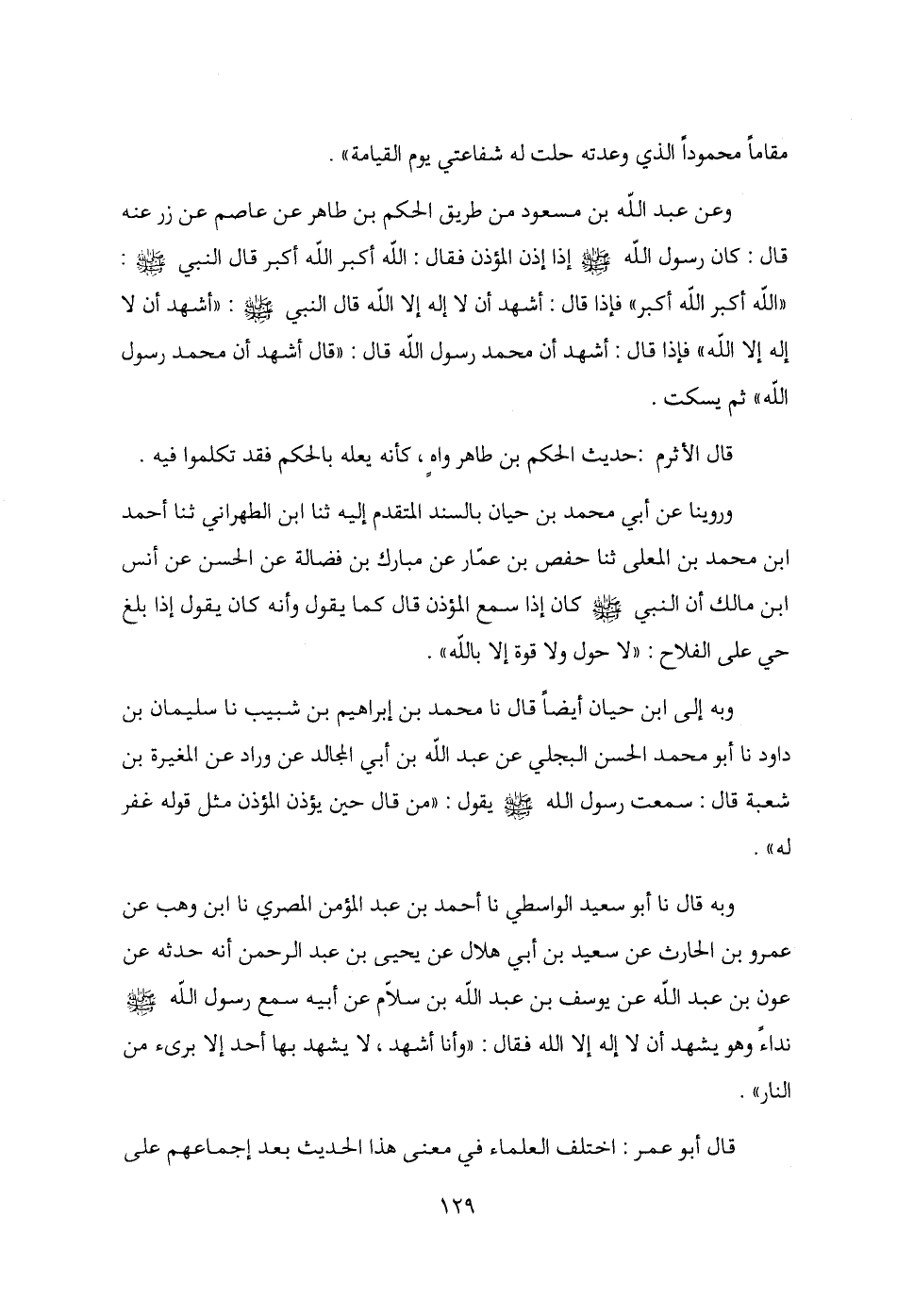 وعن عبد الله بن مسعود من طريق الحكم بن طاهر عن عاصم عن زر عنه قال: كان رسول الله - صلى الله عليه وسلم - إذا إذن المؤذن فقال: الله أكبر الله أكبر قال النبي - صلى الله عليه وسلم -: "الله أكبر الله أكبر" فإذا قال: أشهد أن لا إله إلا الله قال النبي - صلى الله عليه وسلم -: "أشهد أن لا إله إلا الله" فإذا قال: أشهد أن محمد رسول الله قال: "قال أشهد أن محمد رسول الله" ثم يسكت.